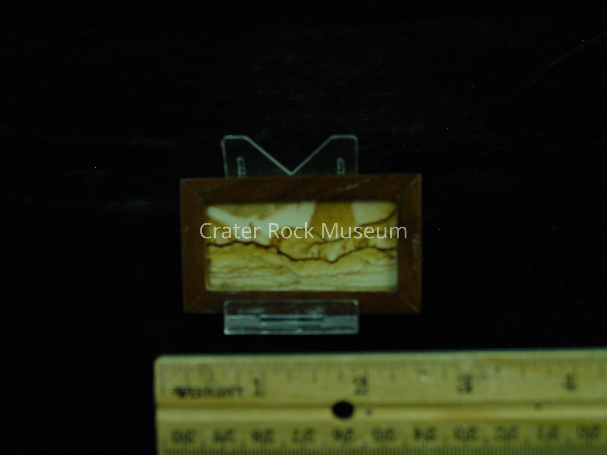 Description: (In Frame) Rectangular, light to dark brown and spotted green on one side and light spotted tan on the other outer mside. Creamy beige towards center with a thick band of red and spotty green.Collection