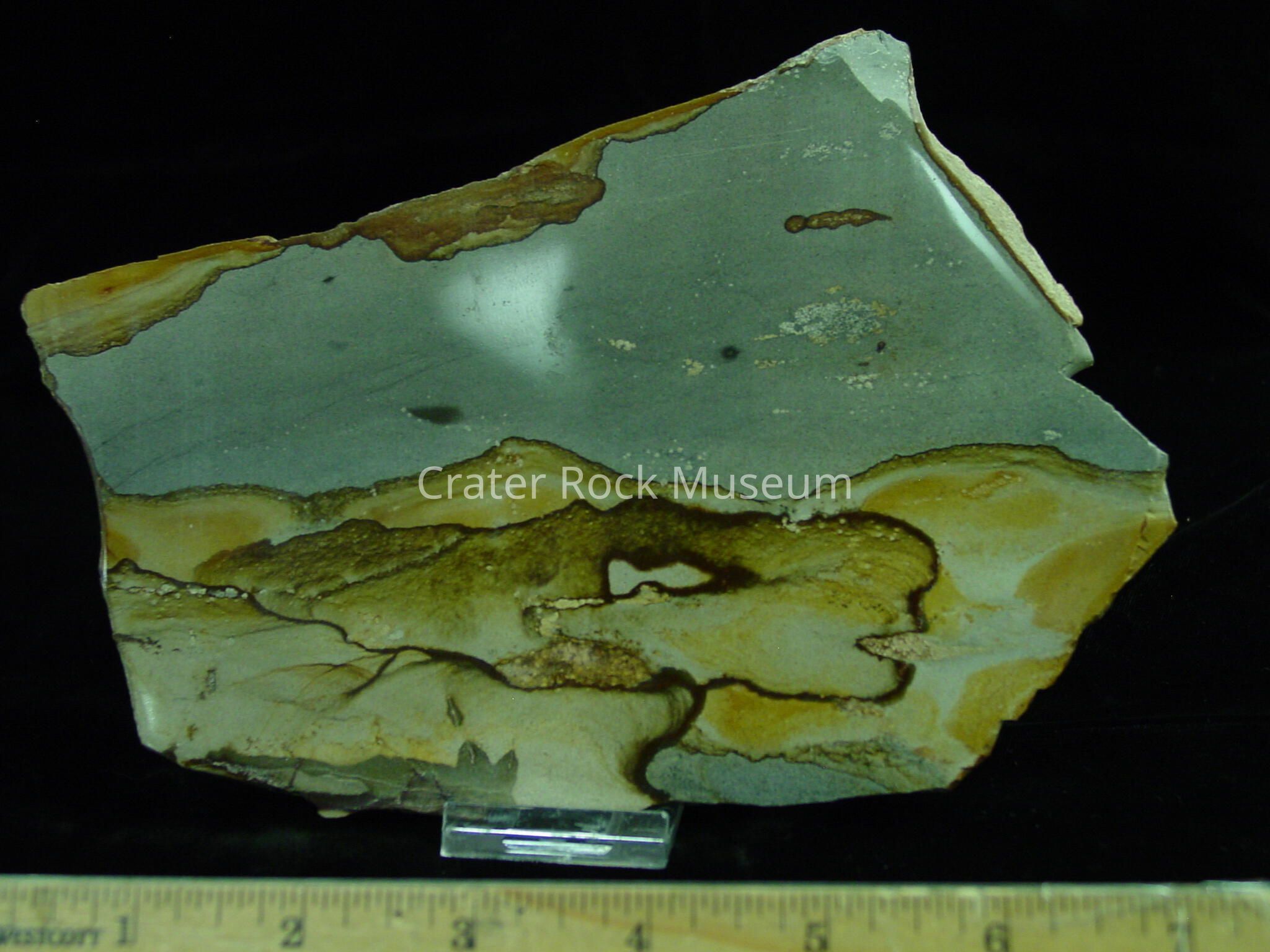 Description: Variable thickness slab with polished face. Gray streak through half of specimen, with beige, tan and dark brown seperations on the remainder of specimen.Collection