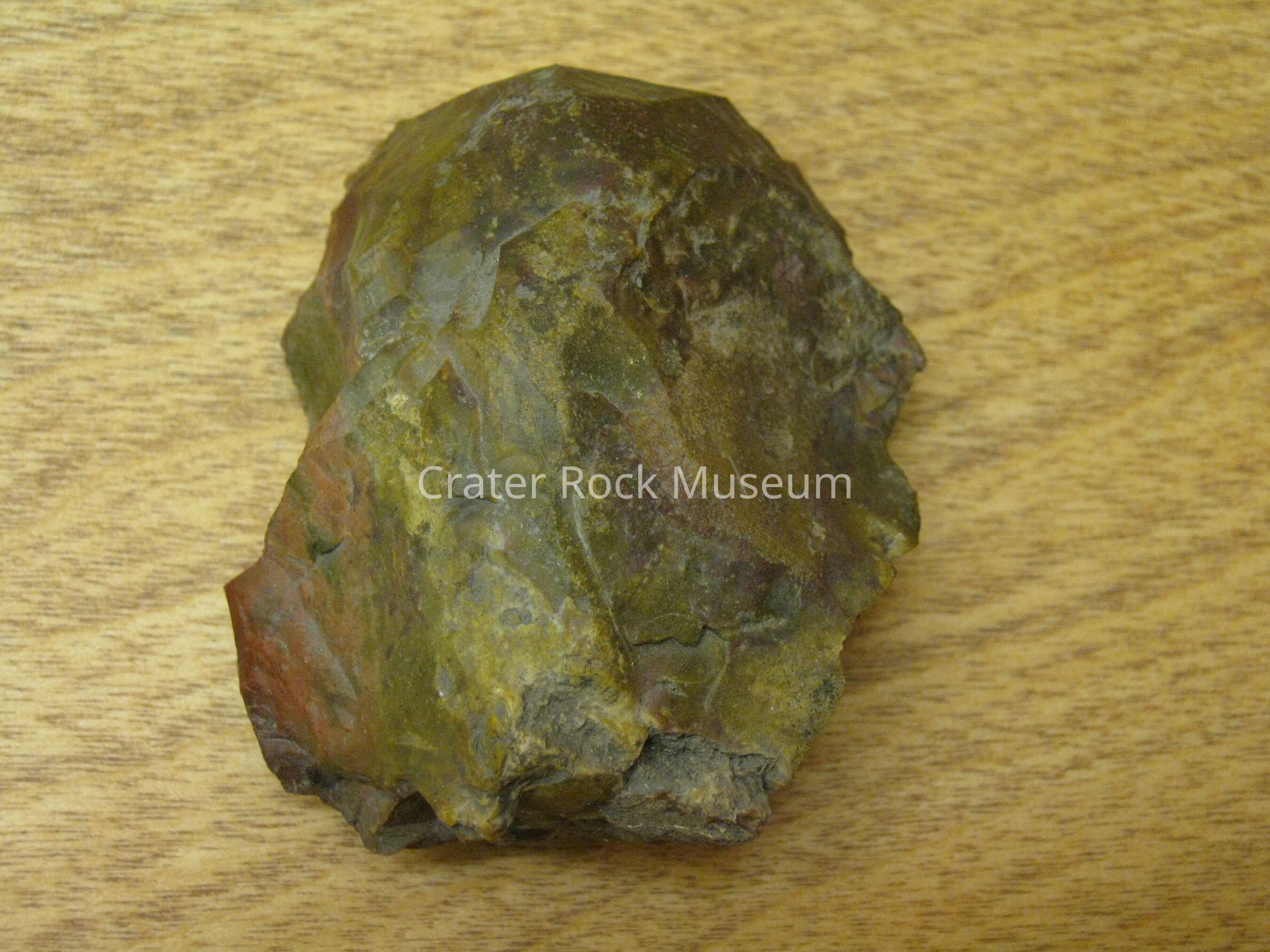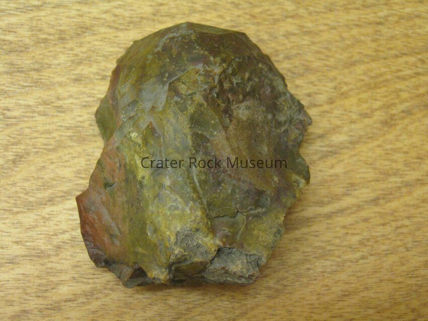 Description: on the top a very dull blend of colors, on the bottom swirls of olive green and red