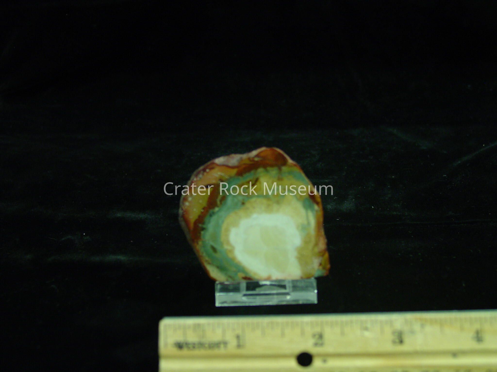Description: Thin slab with polished face. Reddish-brown on outside with green and tan bands on inner area to creamy white center. (Tag says Gilsonite var Jasper)Collection