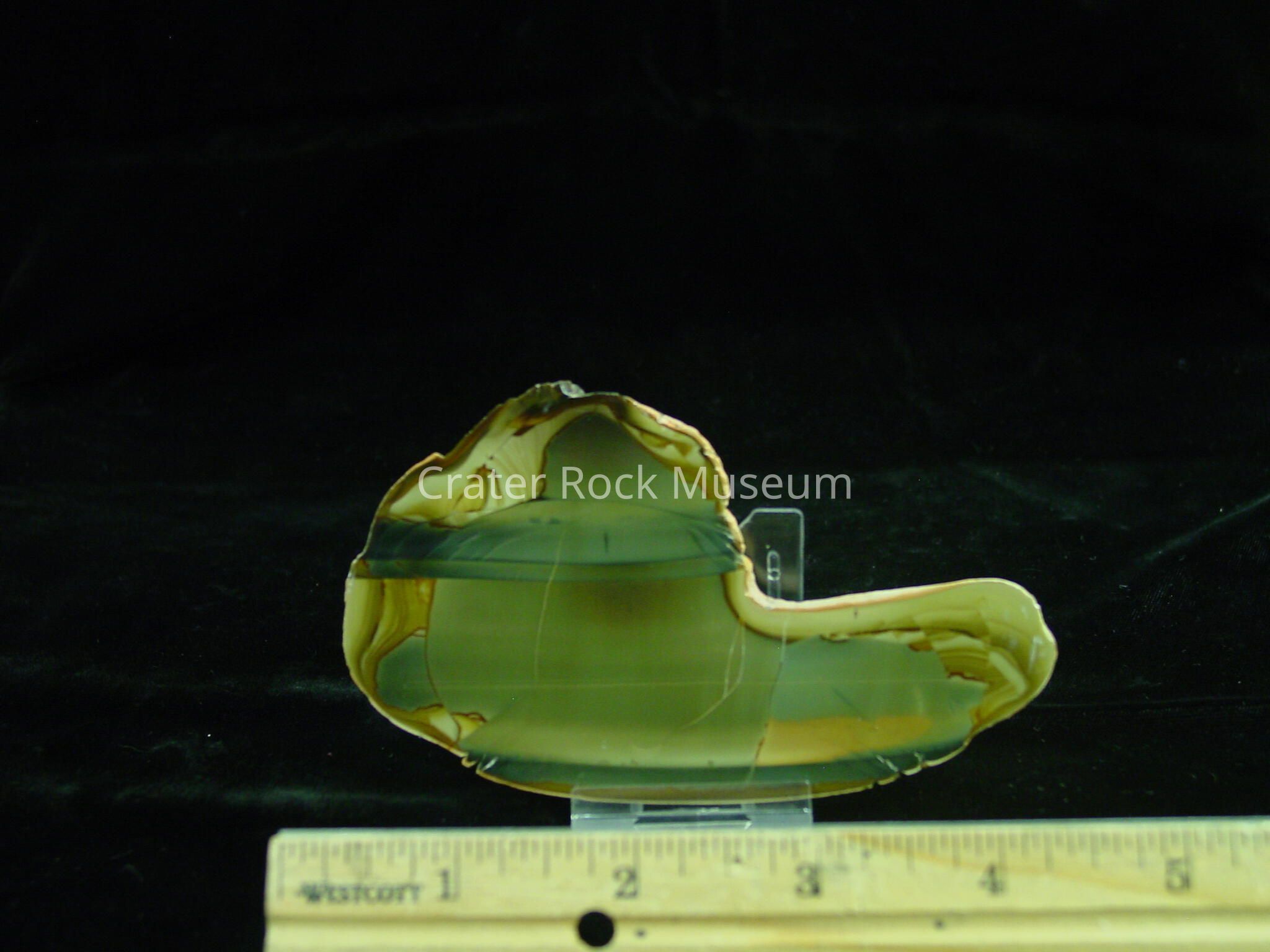 Description: Thin slice with polished face. Tan, brown and yellow outer area with light and dark green in center area. (Tag says Wascoite Jasper).Collection