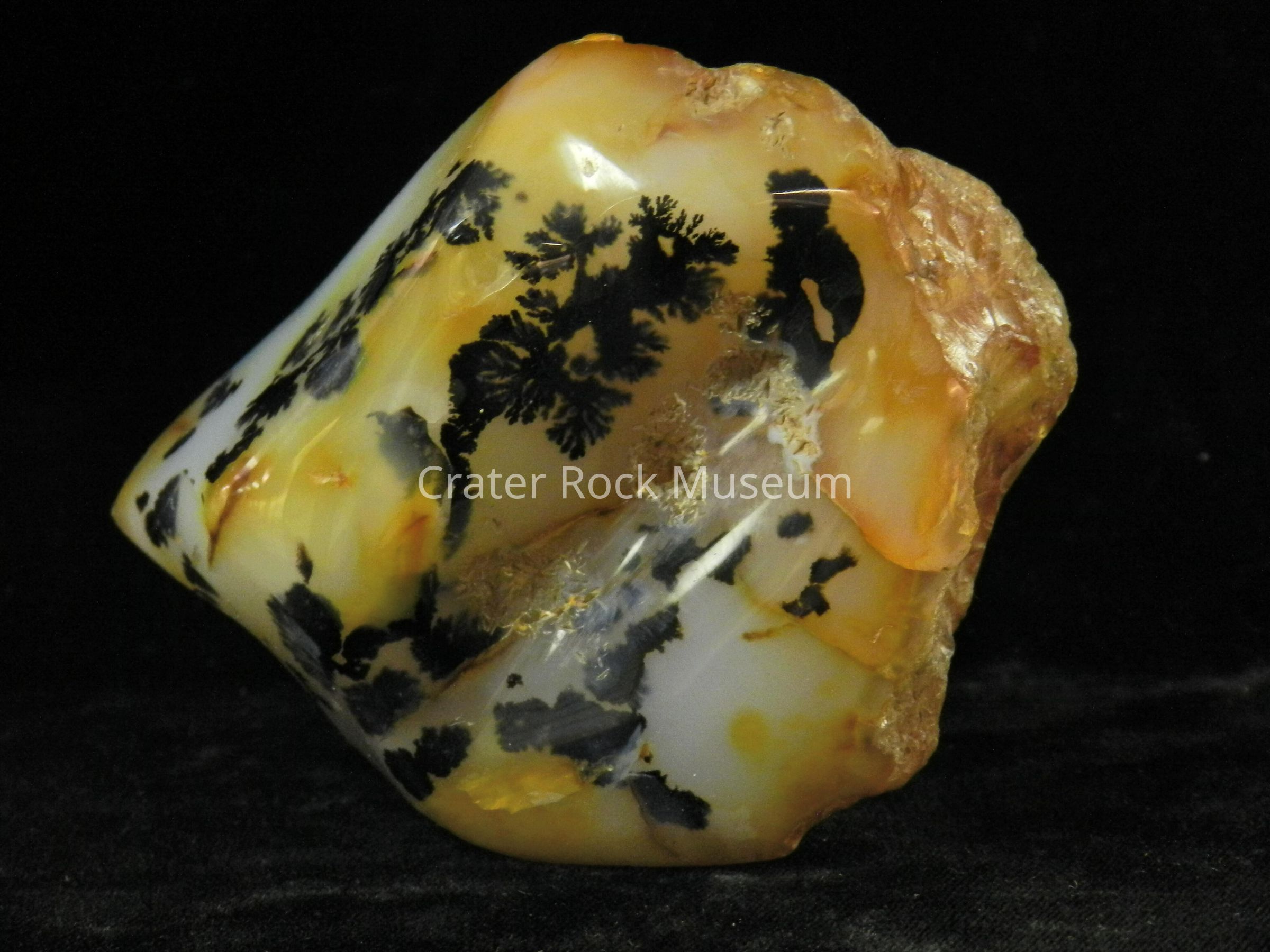 Description: (Dendritic Agate) Multi-sided with most sides polished. Transparent reddish-brown and blue-gray with black dendritic structures throughout.