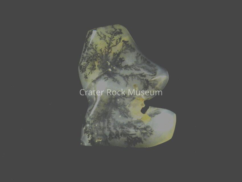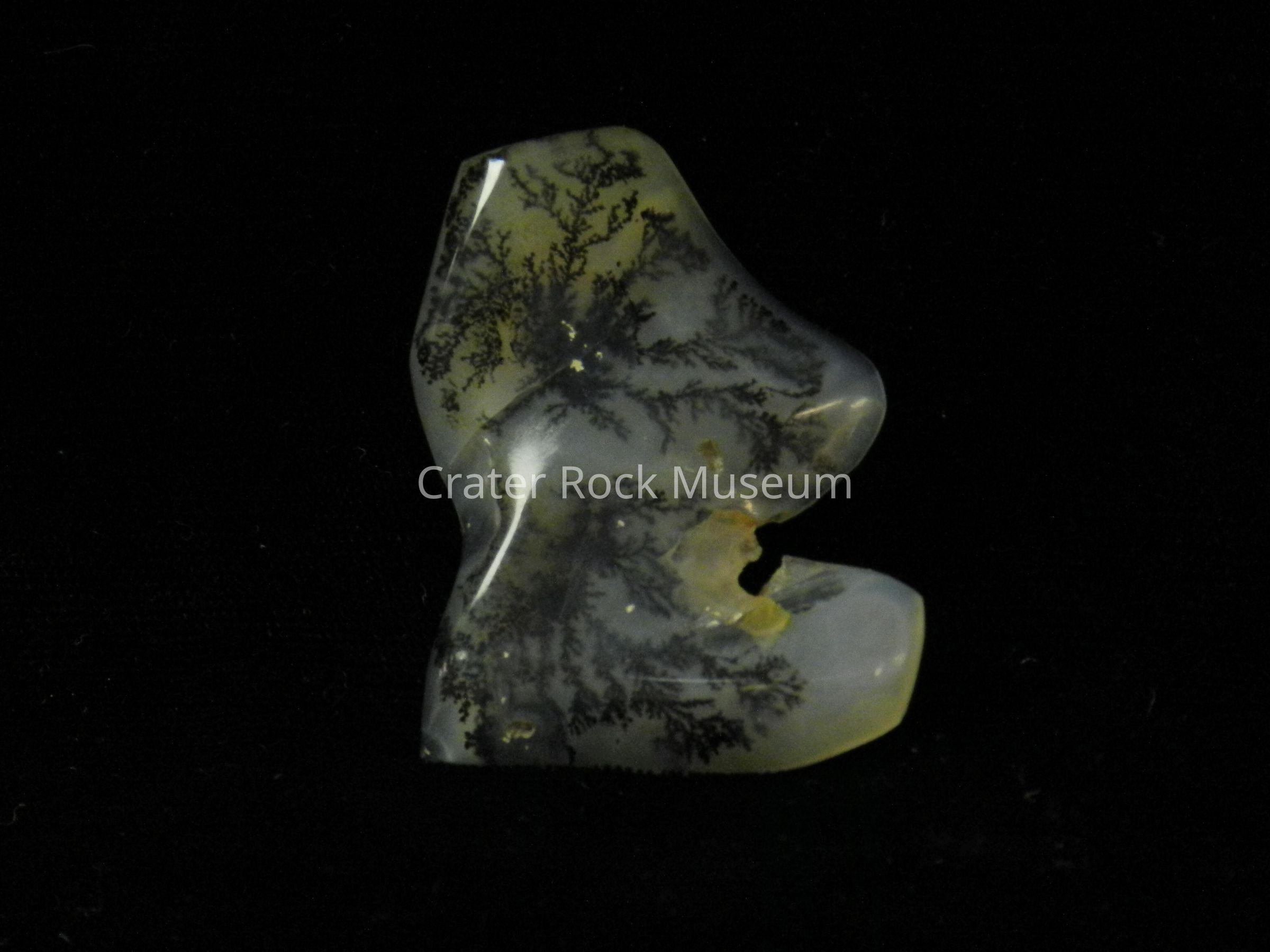 Description: Thin slab with polished back and smooth face. Creamy beige and yellow with black dendritic structures.