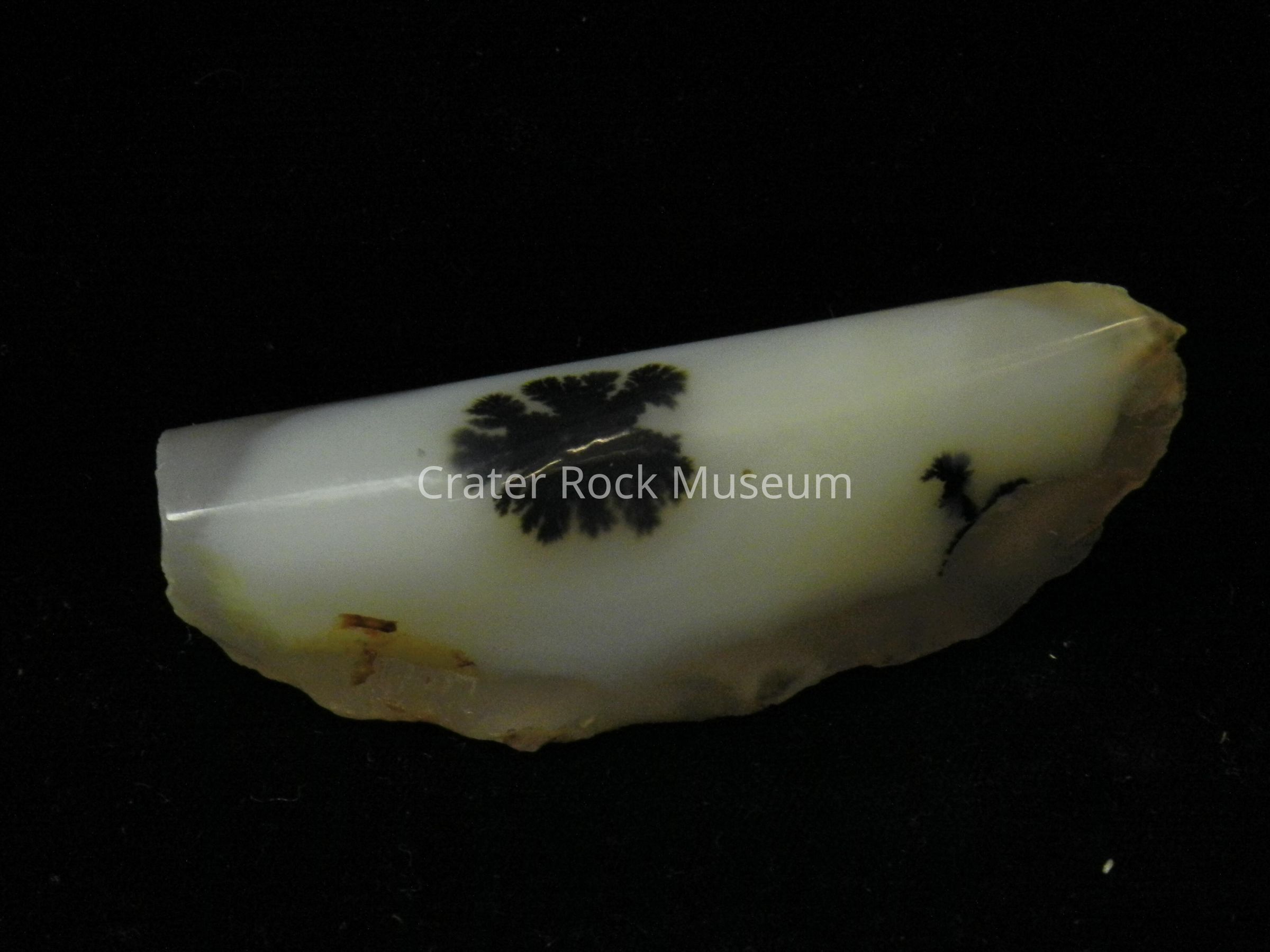 Description: Long, irregular, rough back with creamy white translucent rounded face with one dendritic structure.