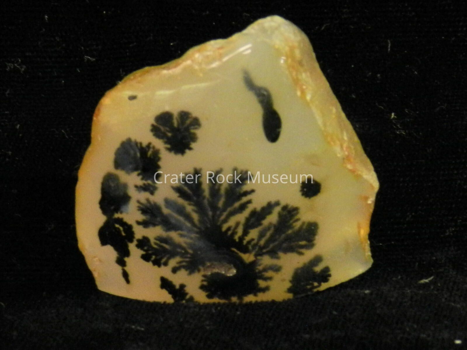 Description: Rough back with polished face. Creamy white with burnt orange around outside edges. One large dendritic structure surrounded by eight smaller ones.
