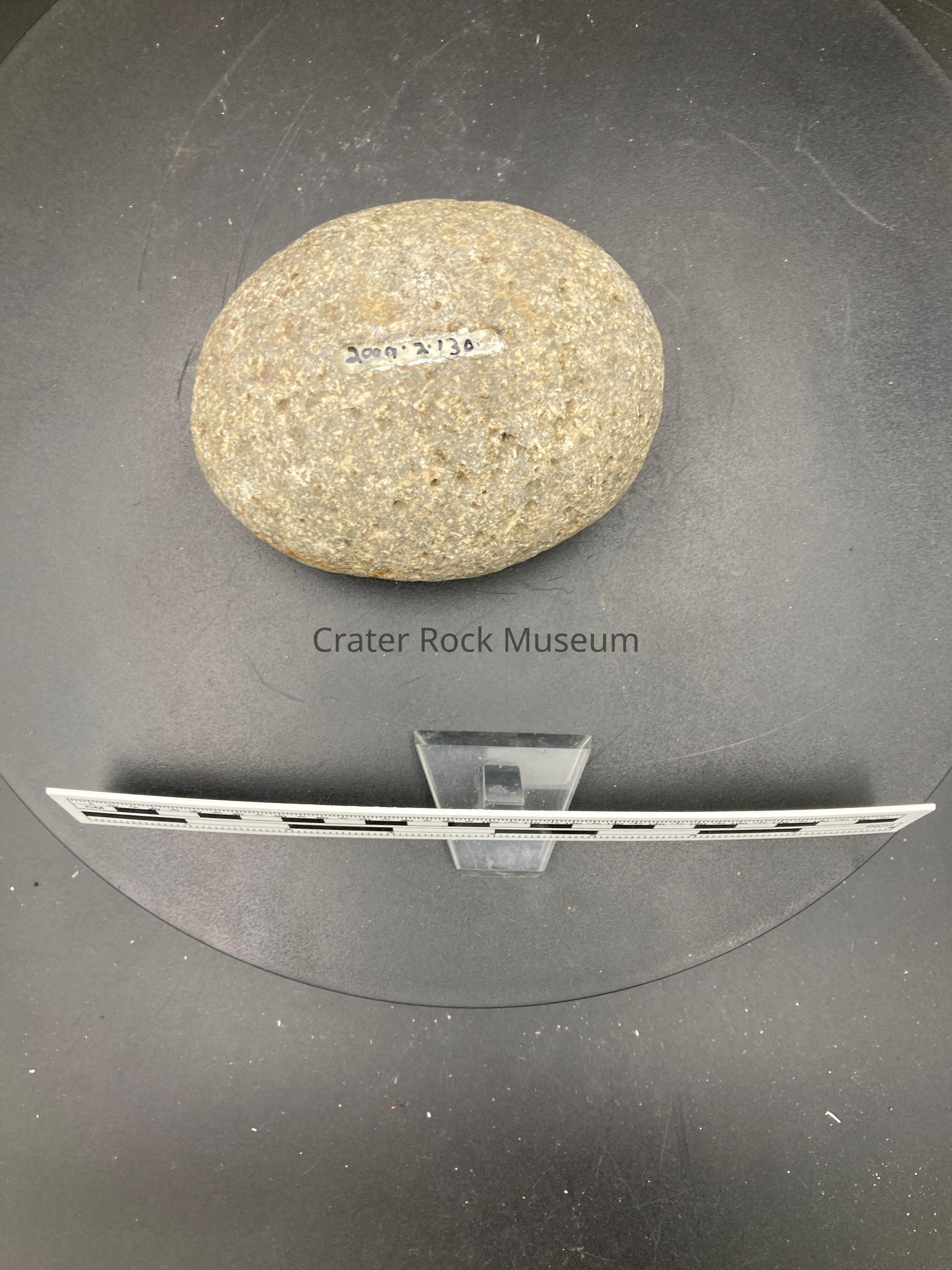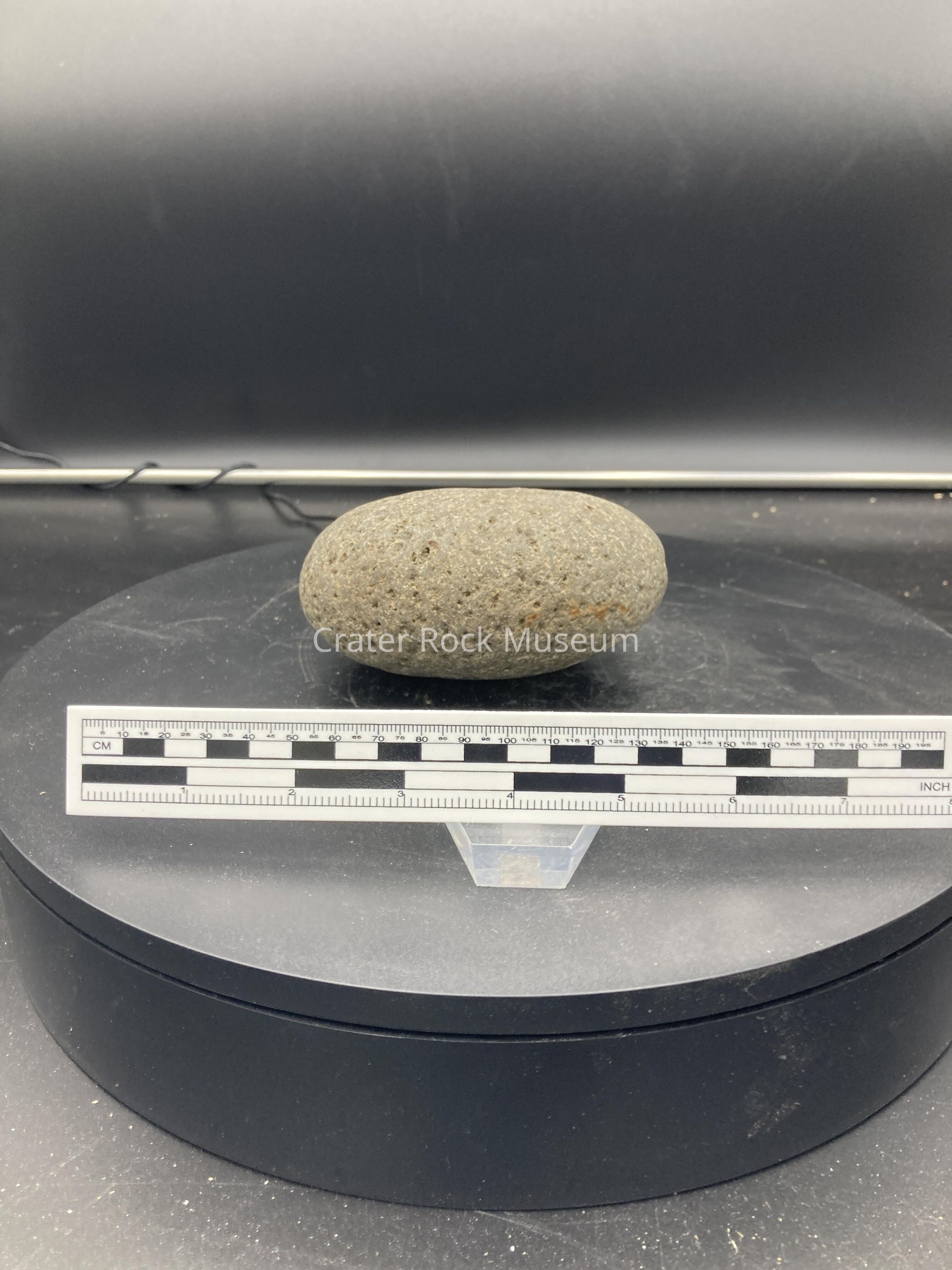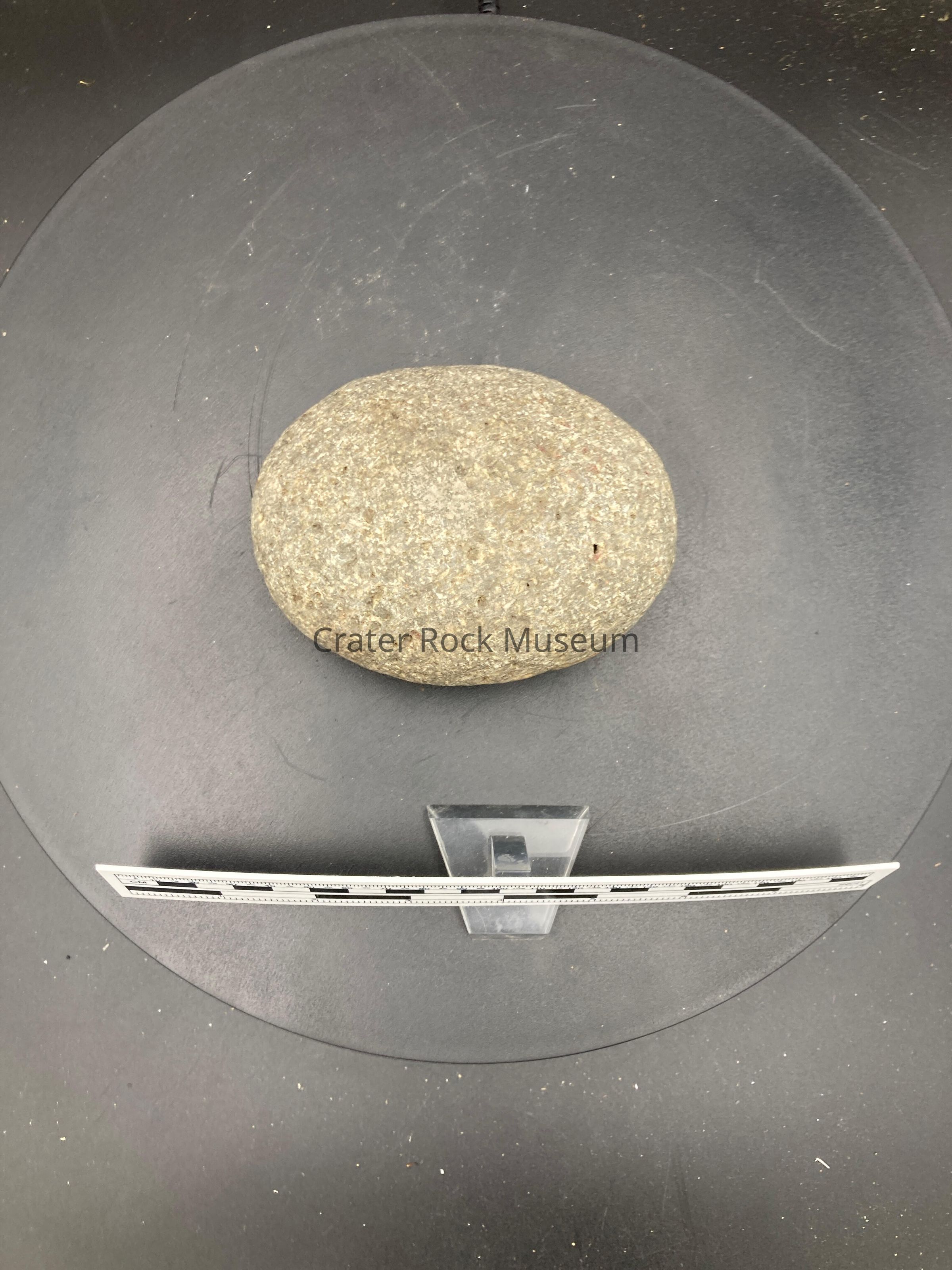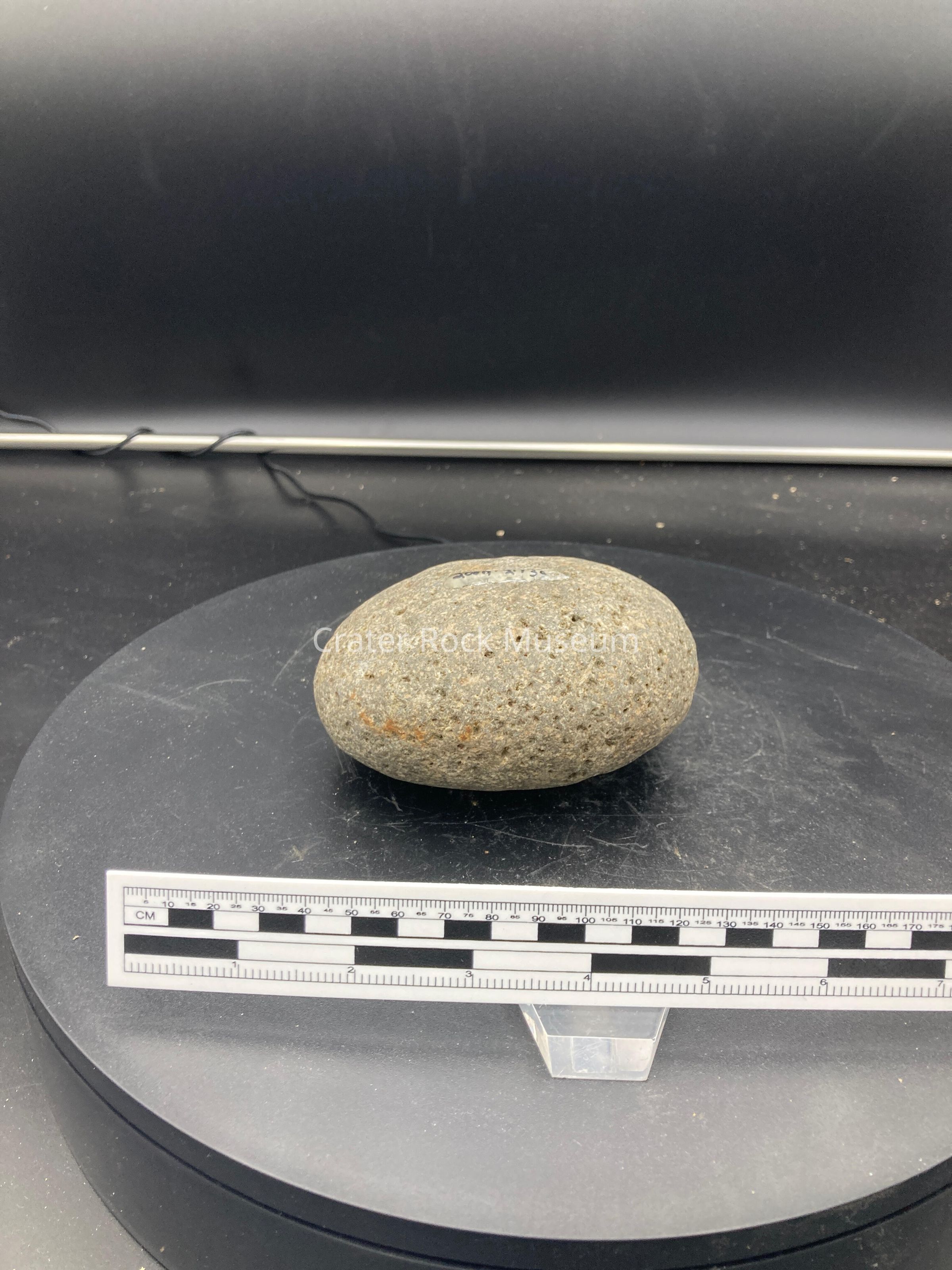 Description: Small grey round stone with tiny dents in it.