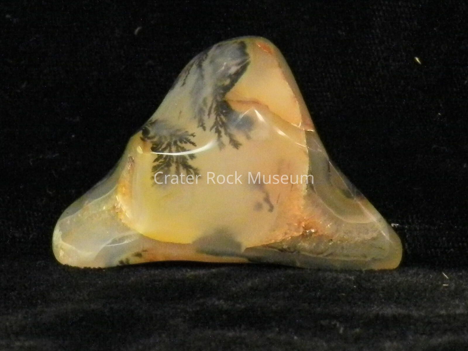 Description: Tumbled, with polished surfaces. Triangular, translucent burnt yellows, reddish-brown and creamy whites. Intermittent dendritic structures.