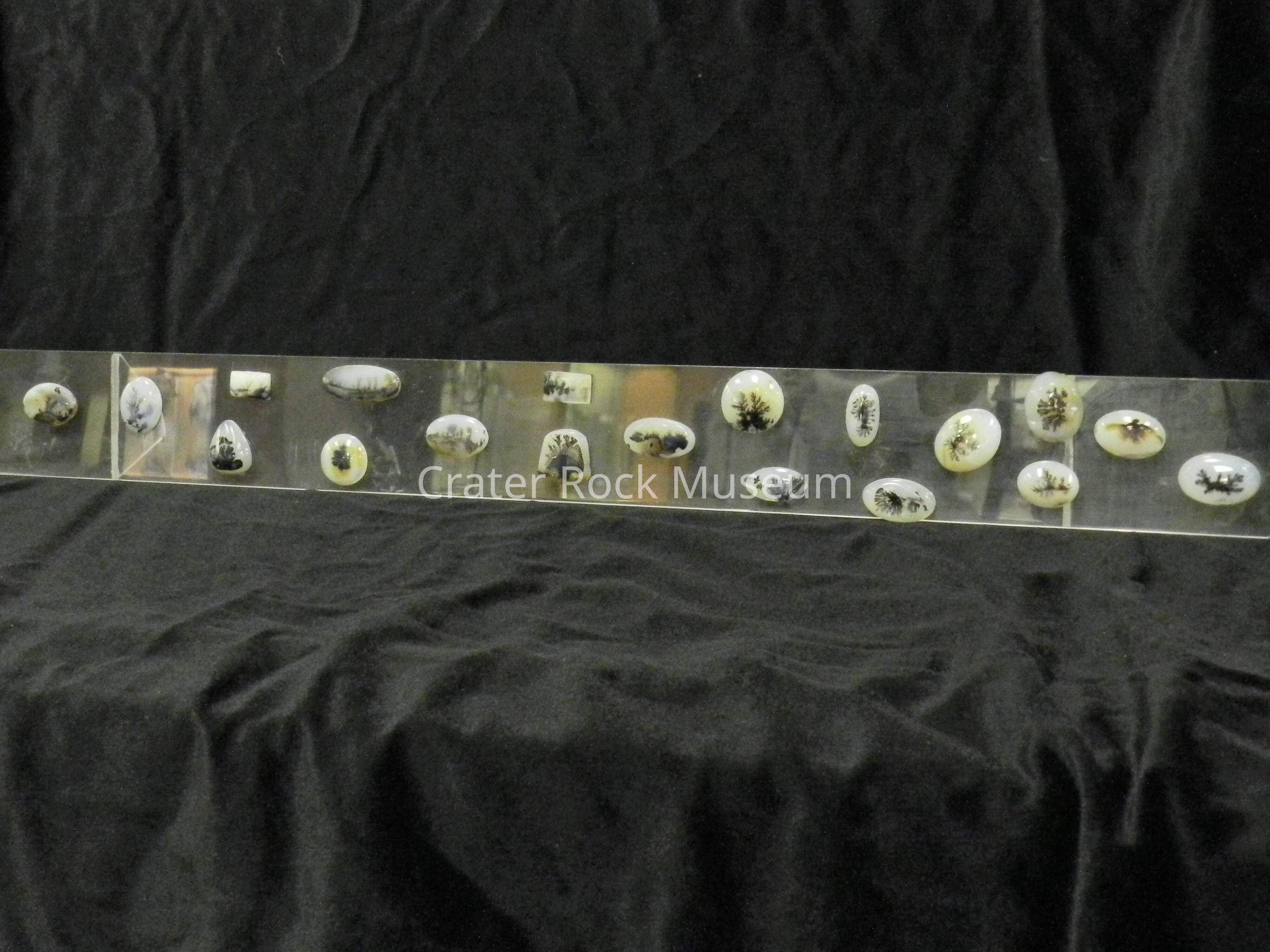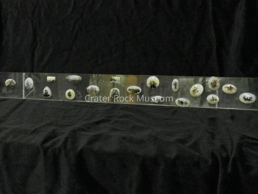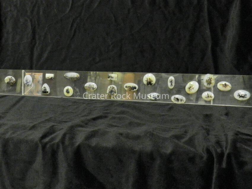 Description: (nineteen mounted specimens) Small oval, round and rectangular dendritic agates mounted on plexiglass.