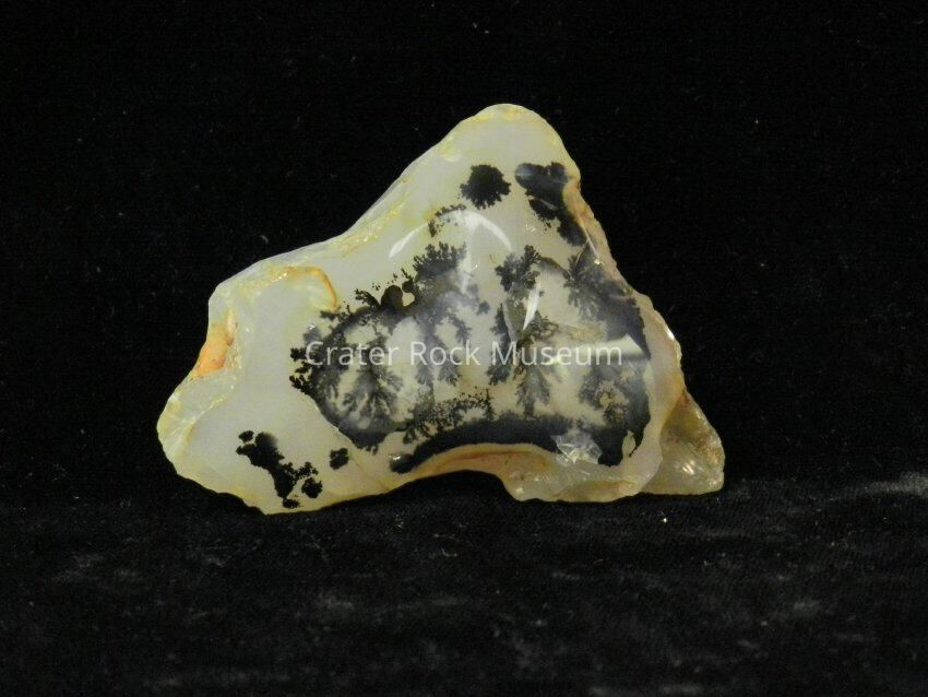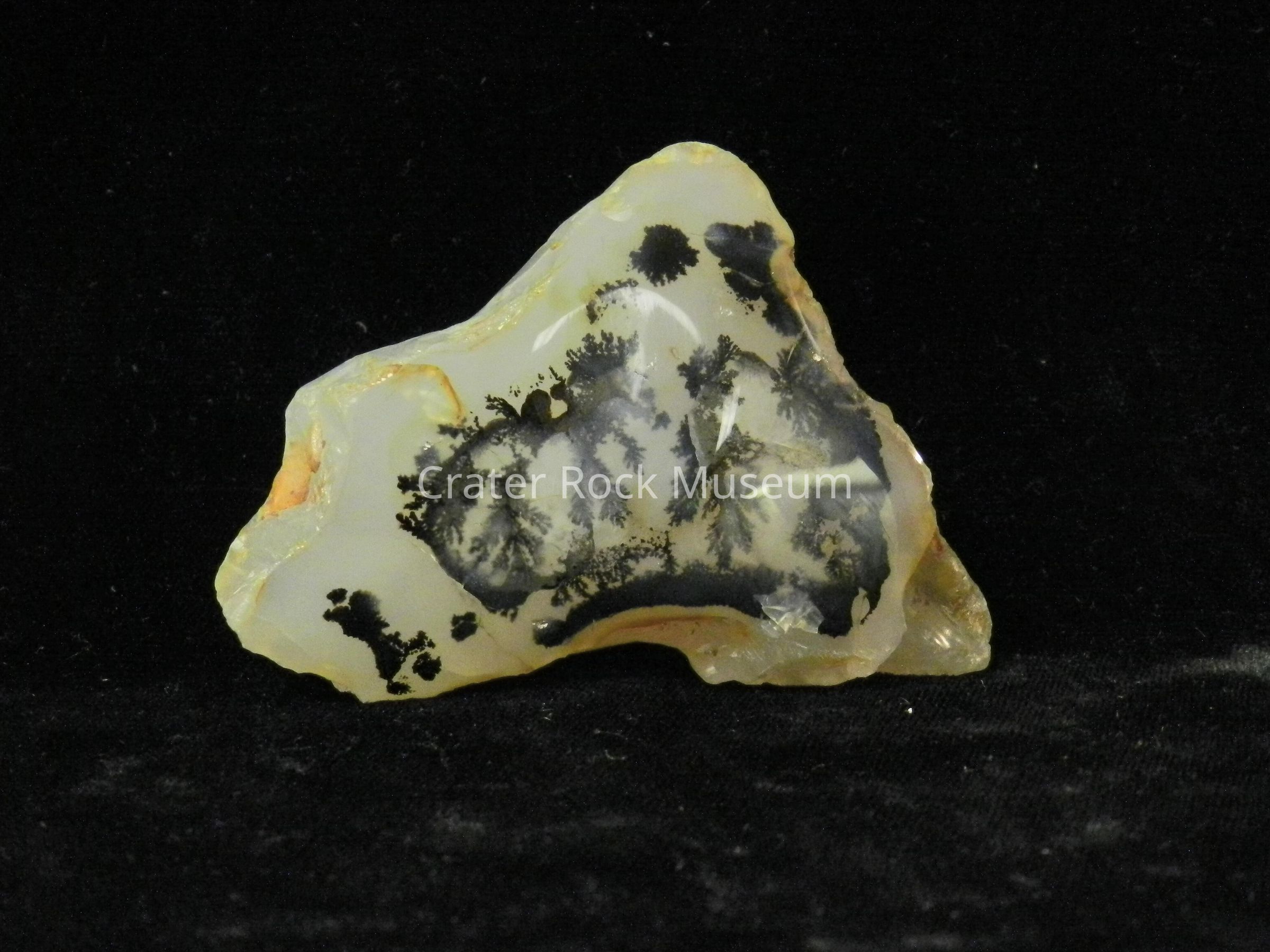 Description: Triangular, rough back with polished (Irregular) face. Translucent creamy white and reddish-brown with a spattering of dendritic structures.