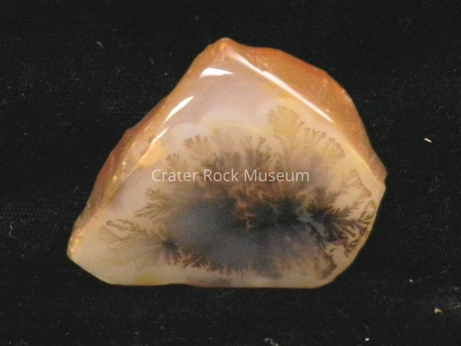 Description: Medium thickness slab with polished face. Translucent creamy white and yellow with a light to dark brown dendritic structure covering most of face.