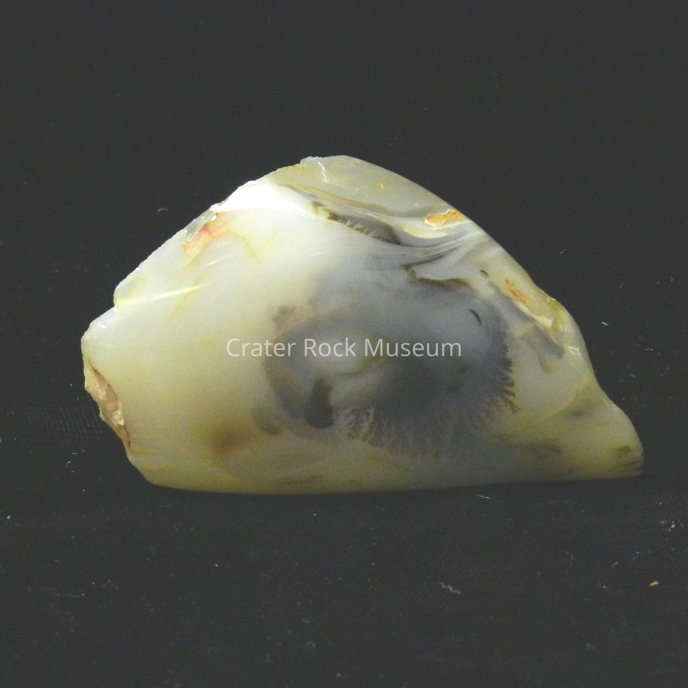 Description: Triangular back with convex polished face. Translucent white and tan with some reddish-brown highlights. Single faded dendritic structure.