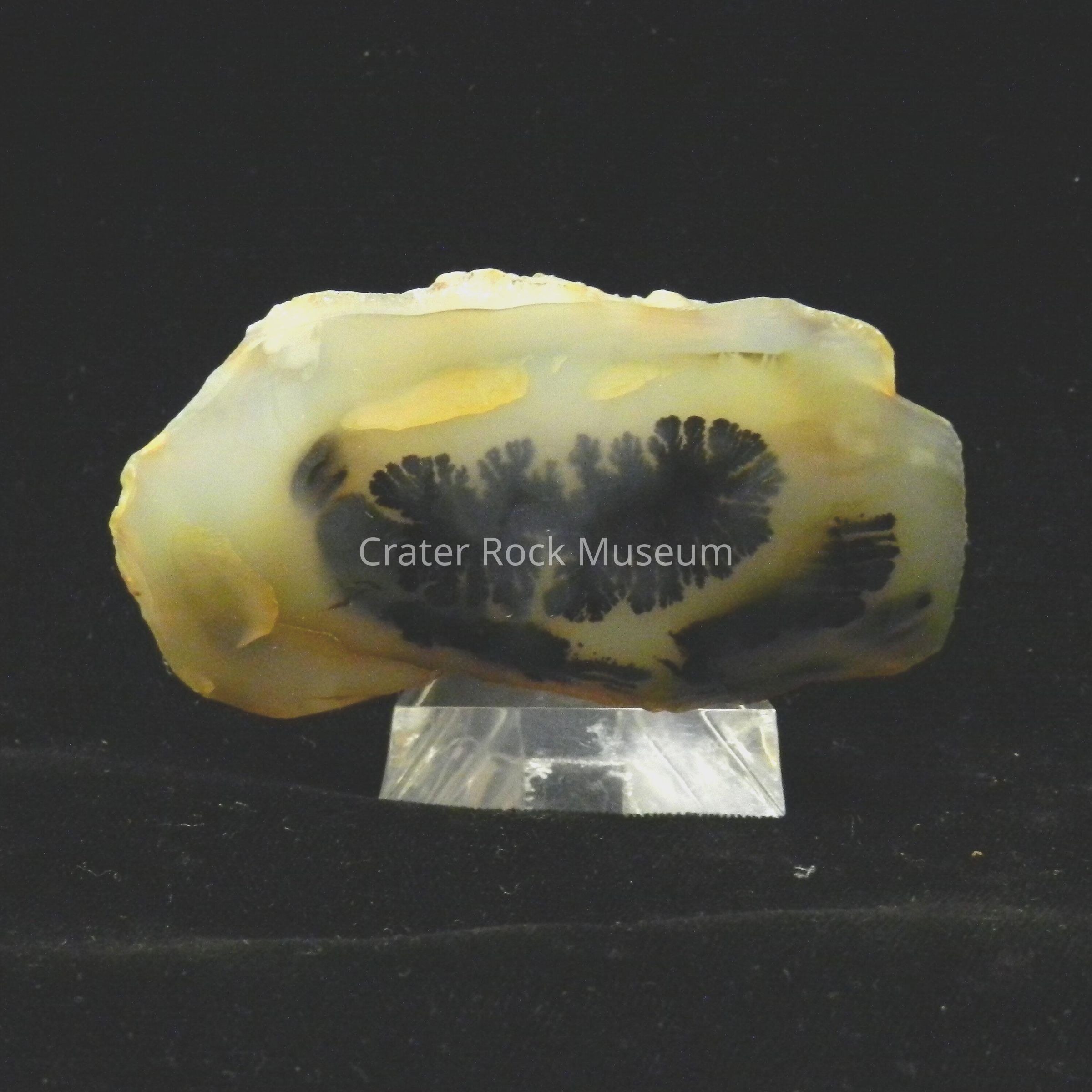 Description: Semi-rectangular thin slab with polished face. Translucent creamy white and yellow with some reddish-brown streaking through and a large dendritic structure in center.