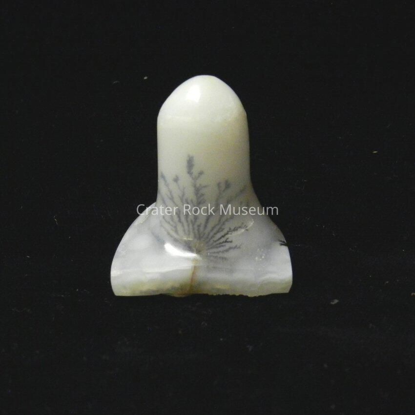 Description: Square base with rounded spire. Creamy white with spidery dendritic structure.