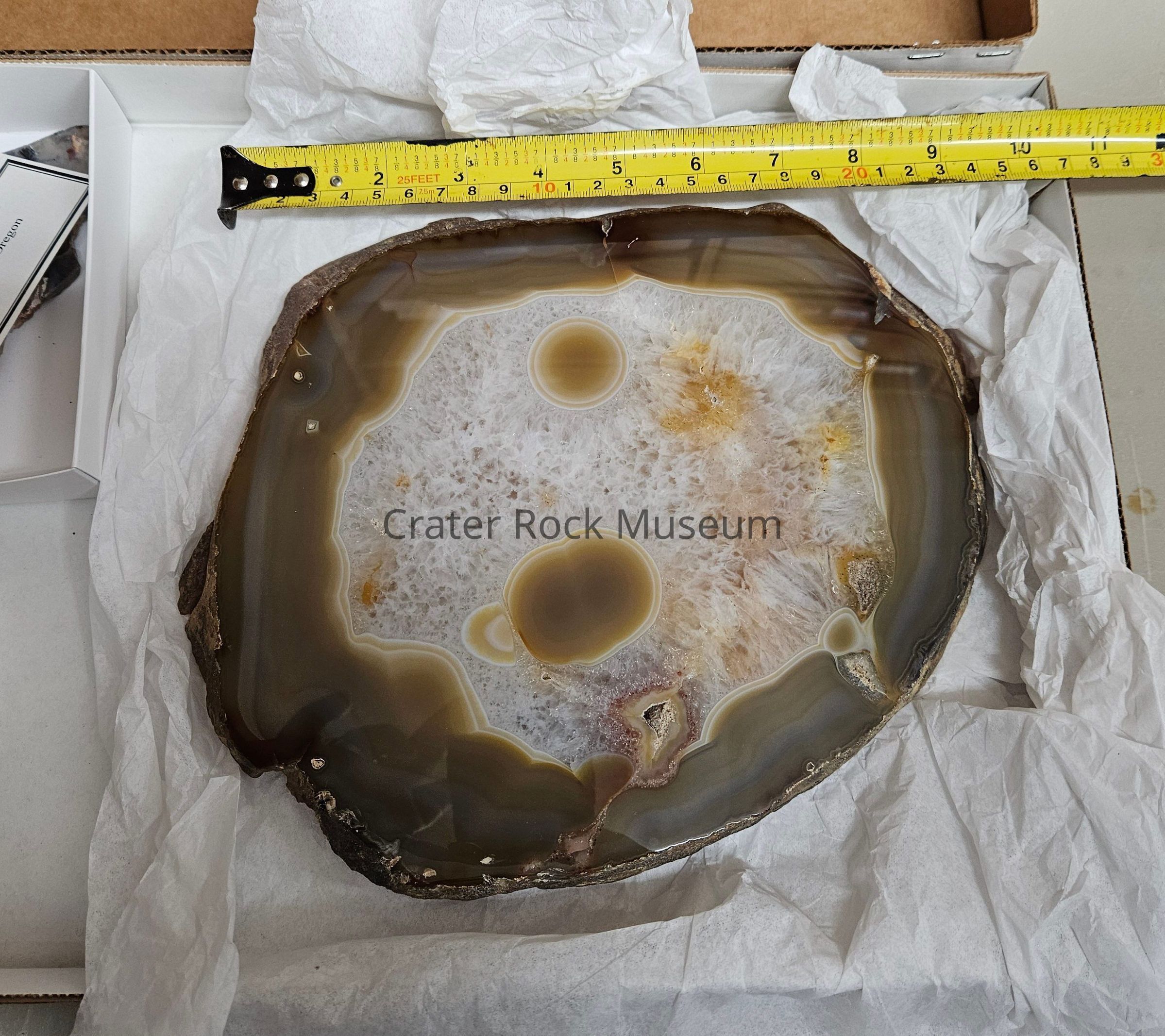 A 3/4" (1.9 cm) thick slab of Agate from Brazil. Polished side shows large Crystalline center in White and Yellow, containing two large stalactites in Mustard, Yellow and White and a Yellow and White Eye. Surrounding Agate is fortified in White,Mustard, Yellow, Grey and some Orange at outer edge.Three Medium holes are seen with Crystalline centers, one with Red edging. Infiltration hole visible.Dimensions