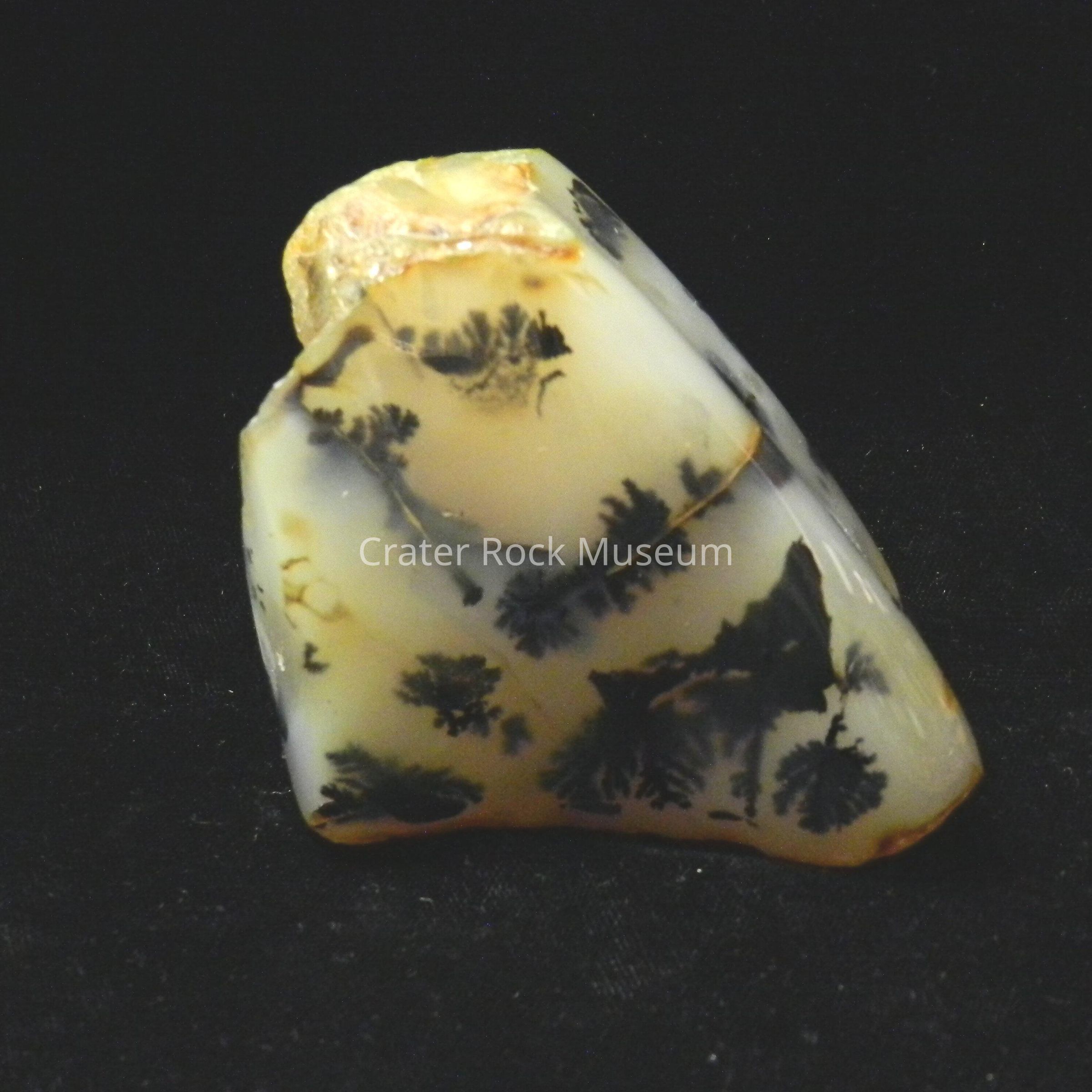 Description: Thick, triangular slab with polished face. Translucent white and blue-gray with reddish-brown highlights and numerous dendritic structures.