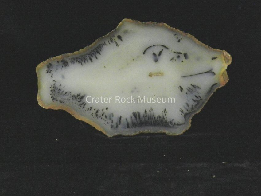 Description: Thin slice with polished face. Translucent creamy white with reddish-brown outer edges. Dendritic structure is in a band on outer perimeter.