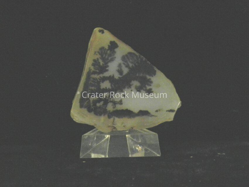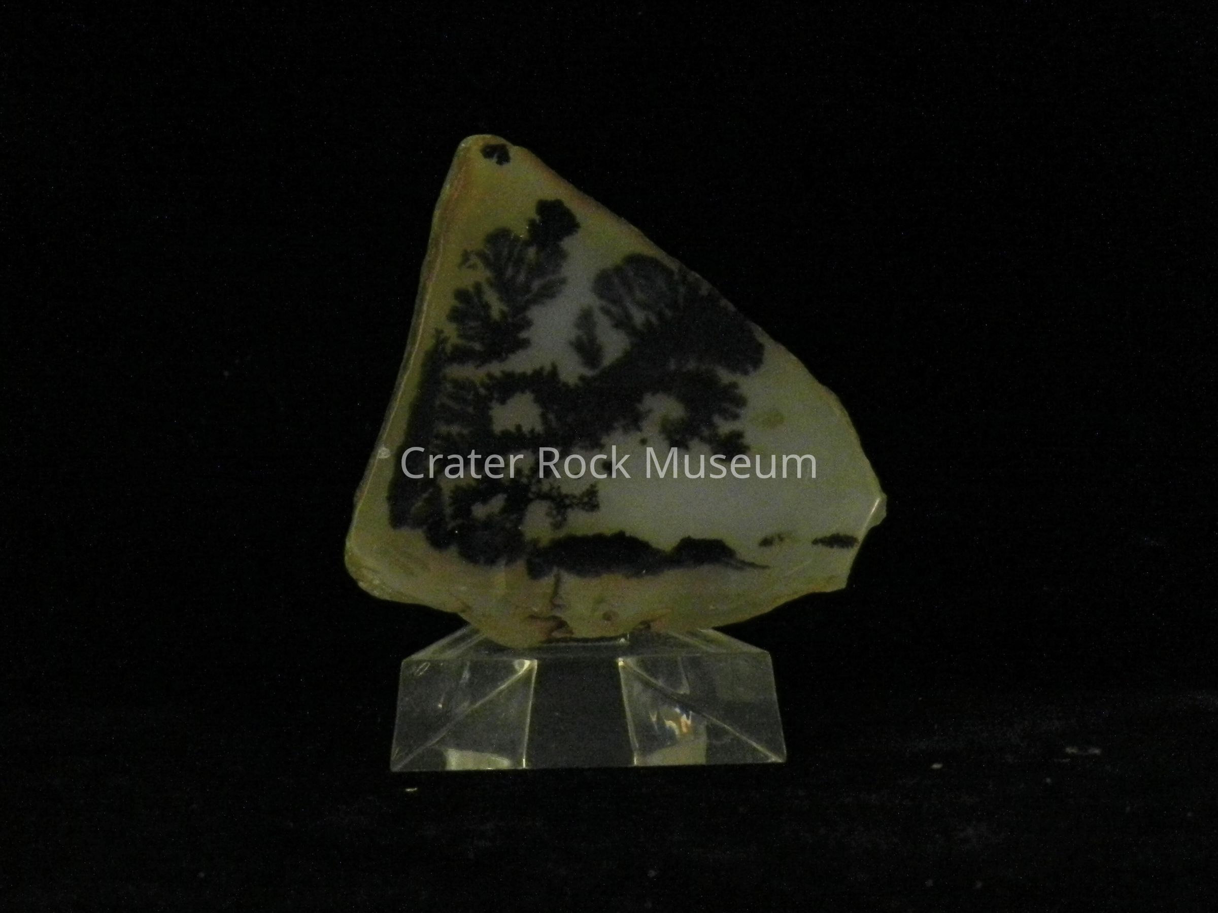 Description: (Mounted) Semi-triangular thin slice with polished face. Translucent creamy tan and white with multi-branched dendritic structure.