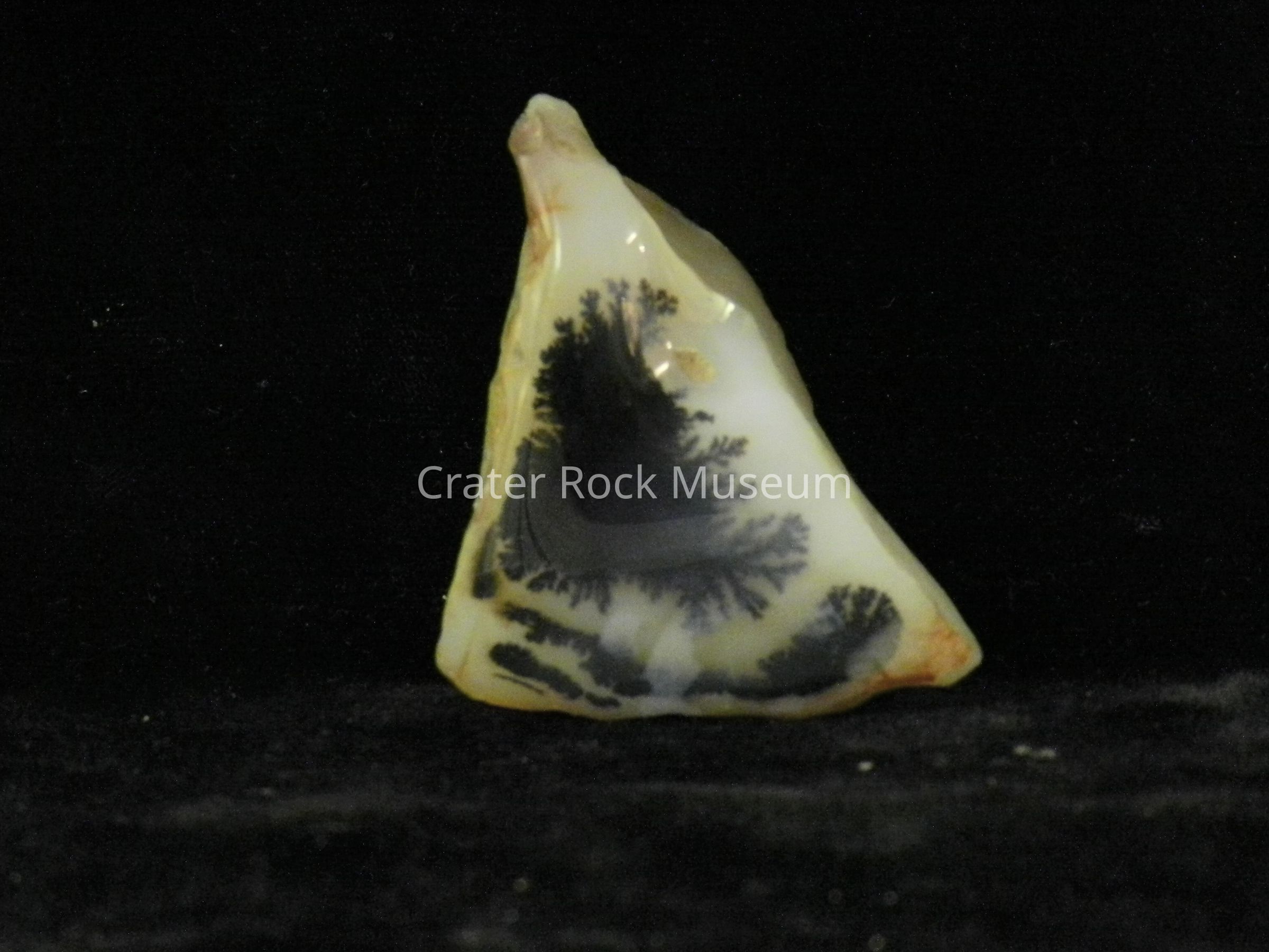 Description: Thick triangular slab with rough back and polished face. Creamy white with large area of dendritic structure.