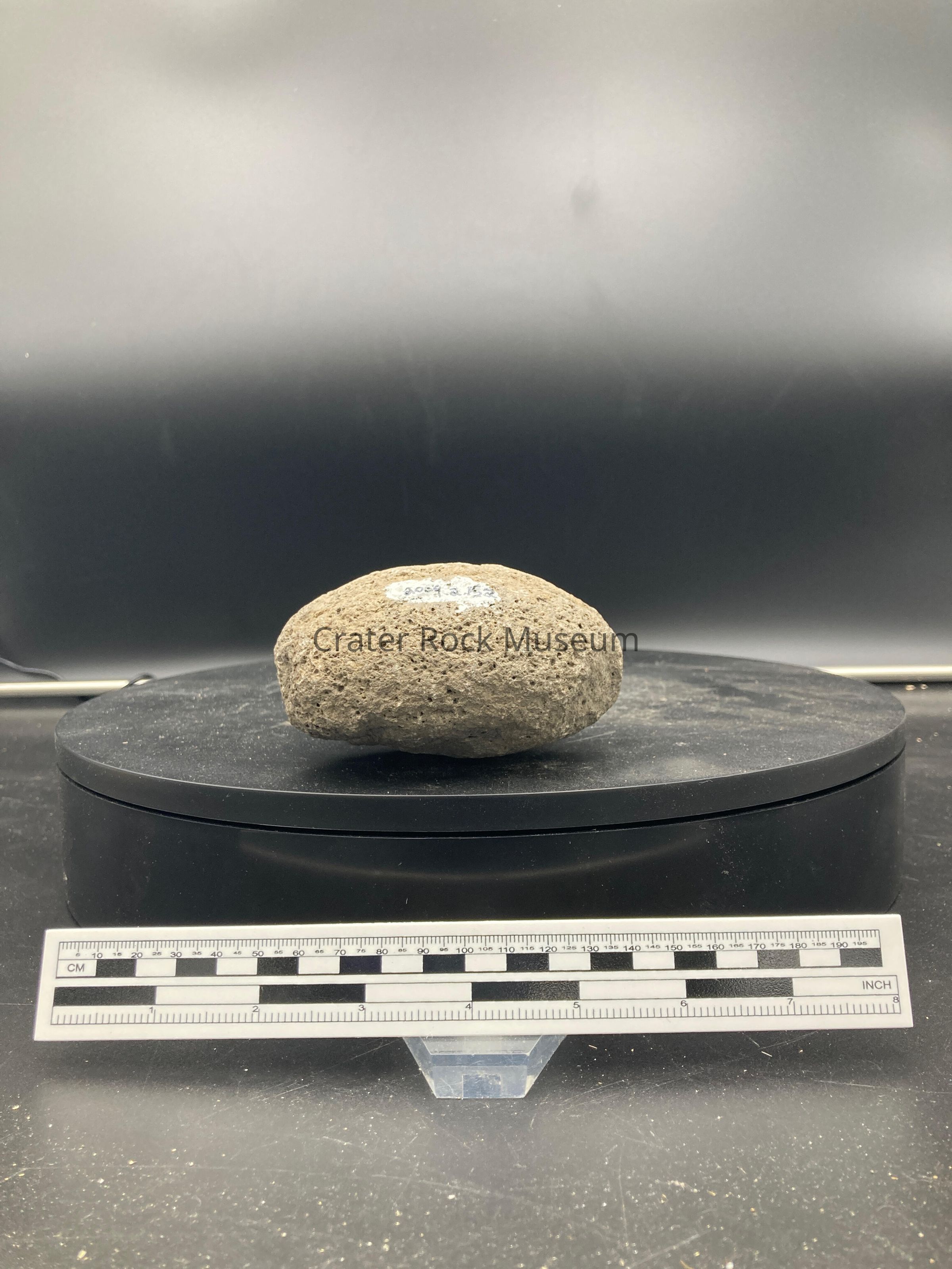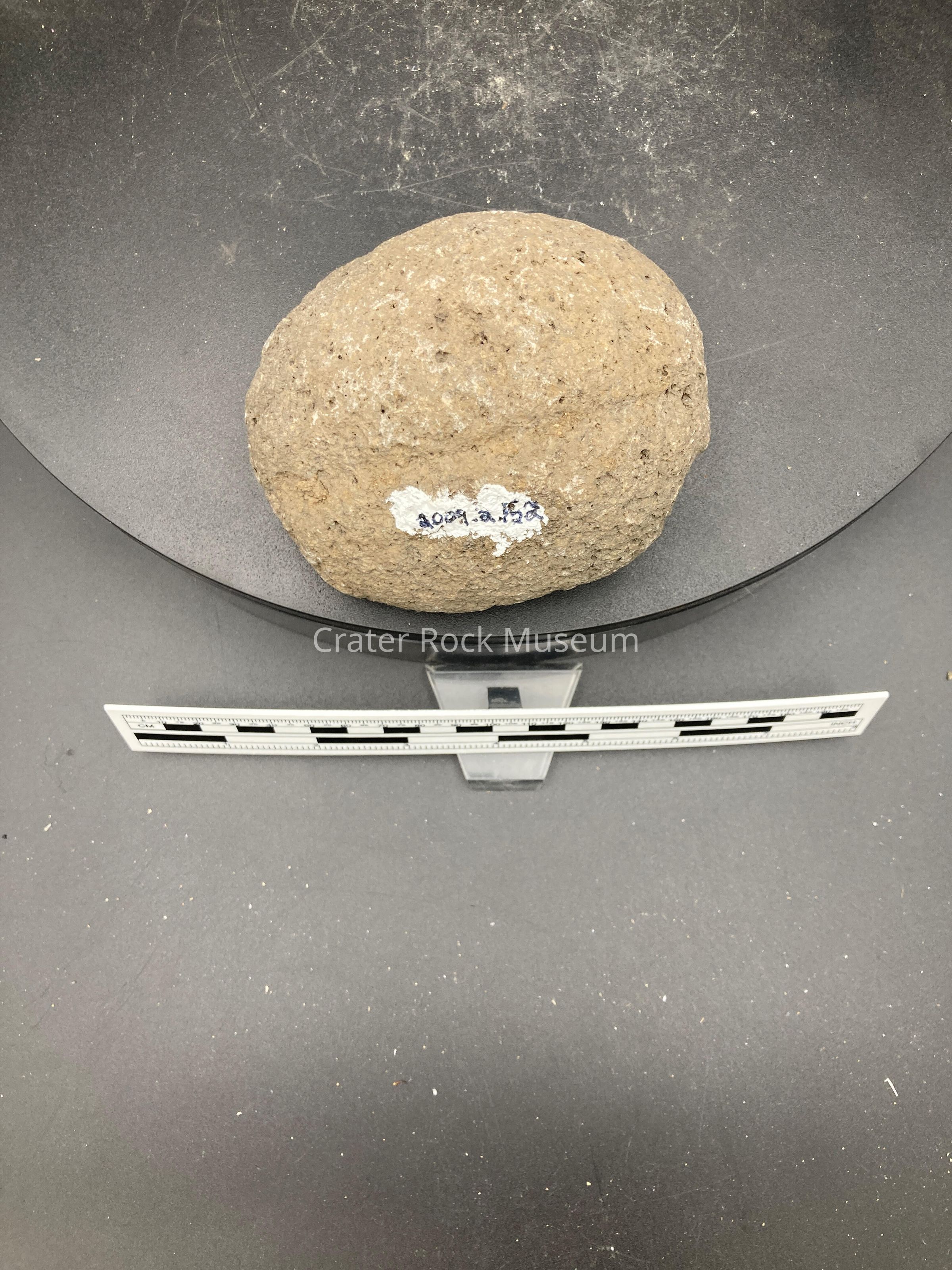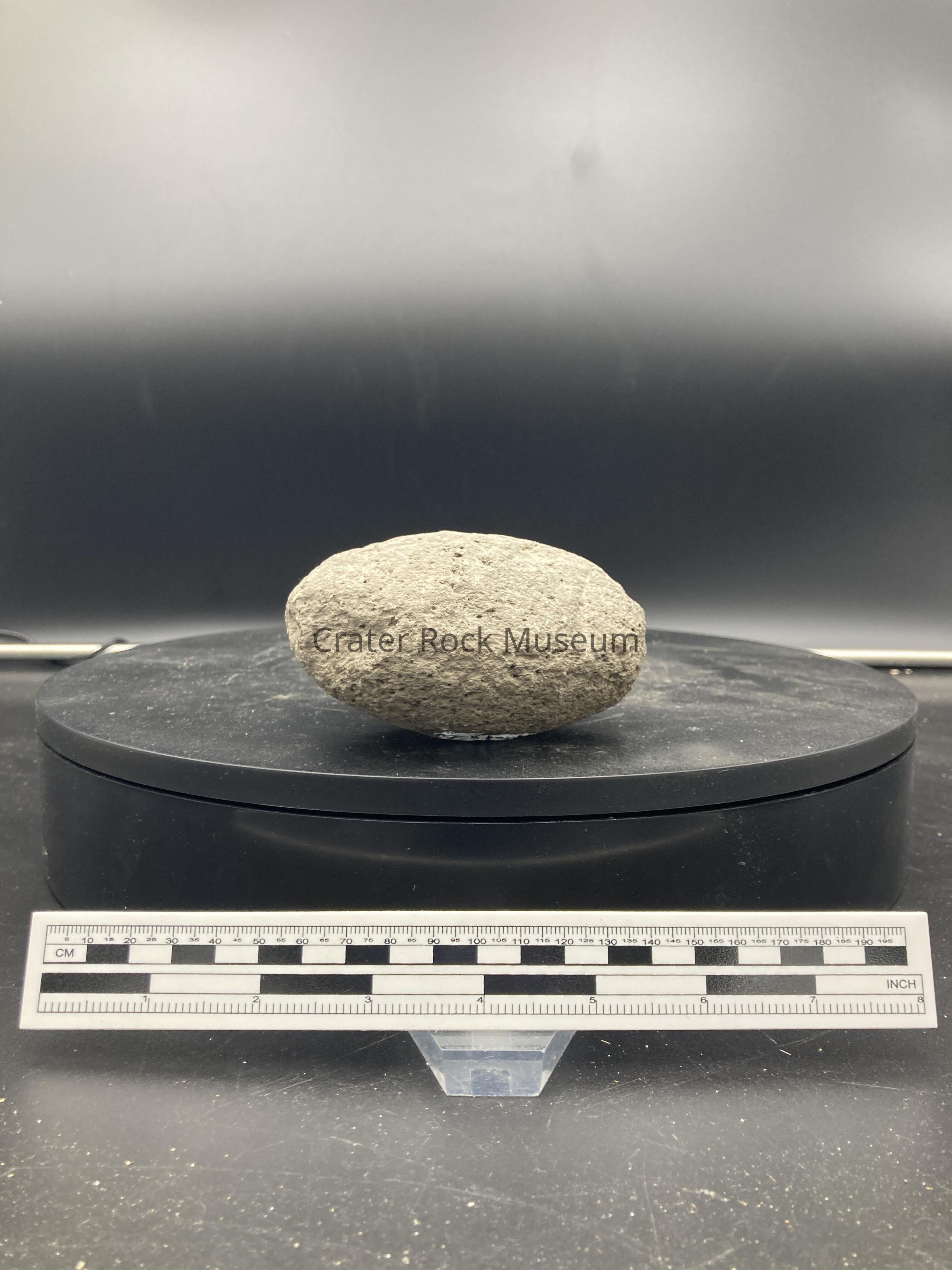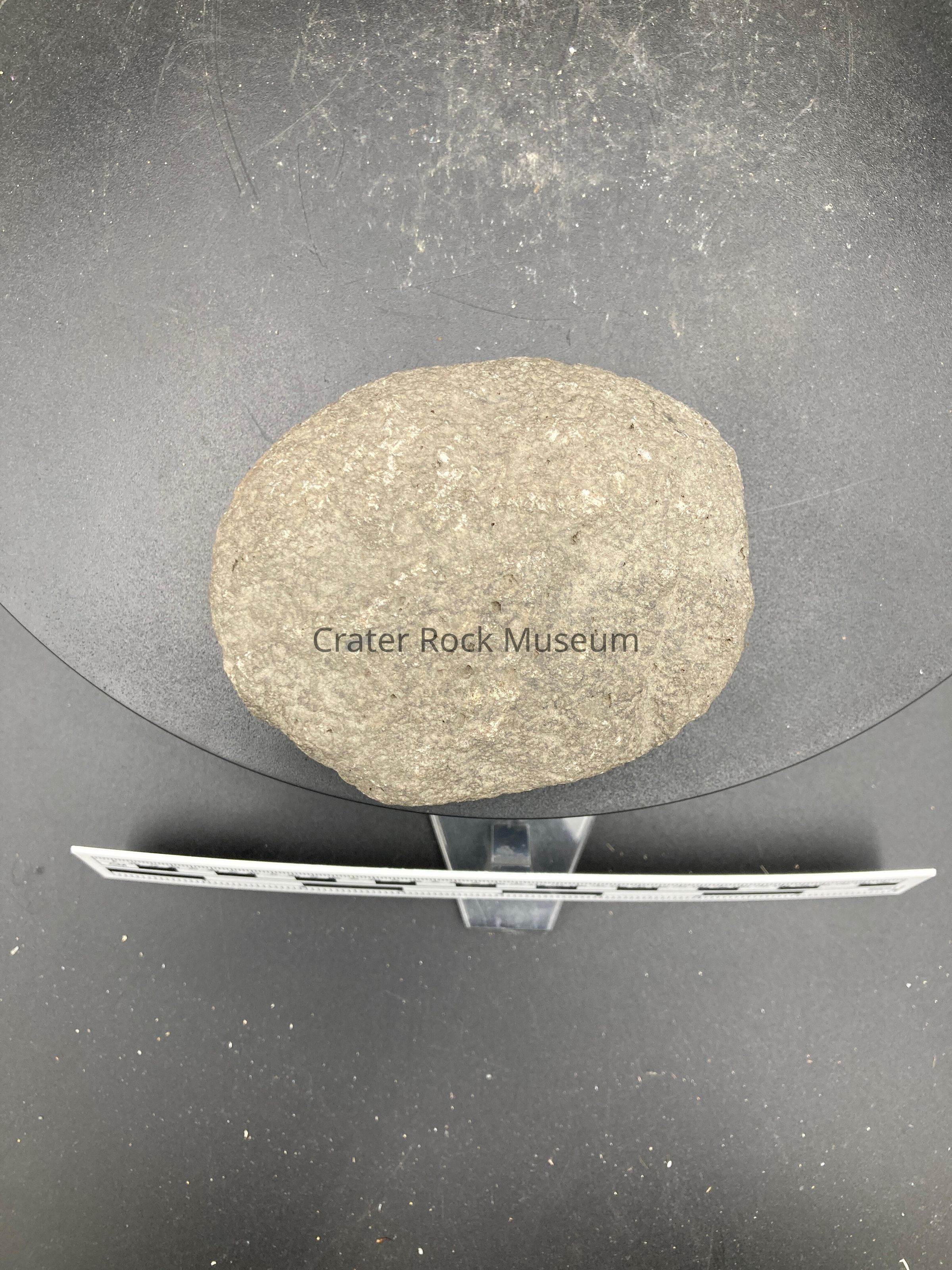 Description: Small grey rock with dents in it.
