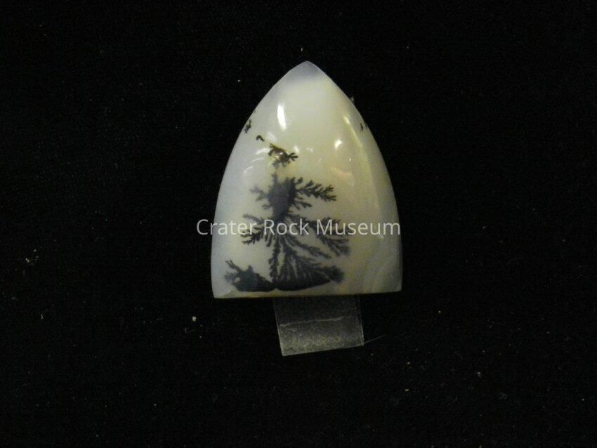 Description: Spearpoint shaped with flat smooth back and a polished convex face. Translucent creamy white with one dendritic structure with multiple branches.