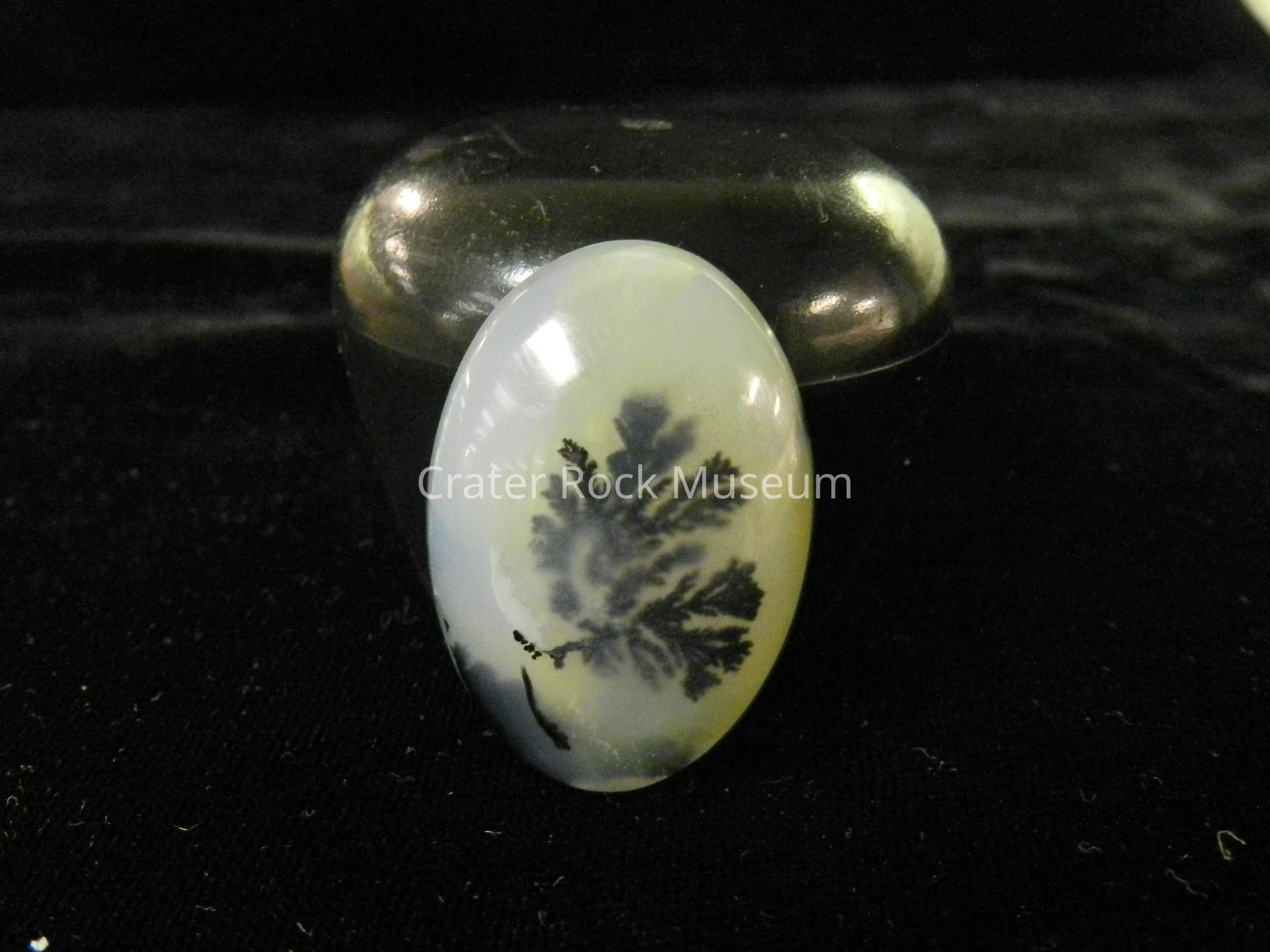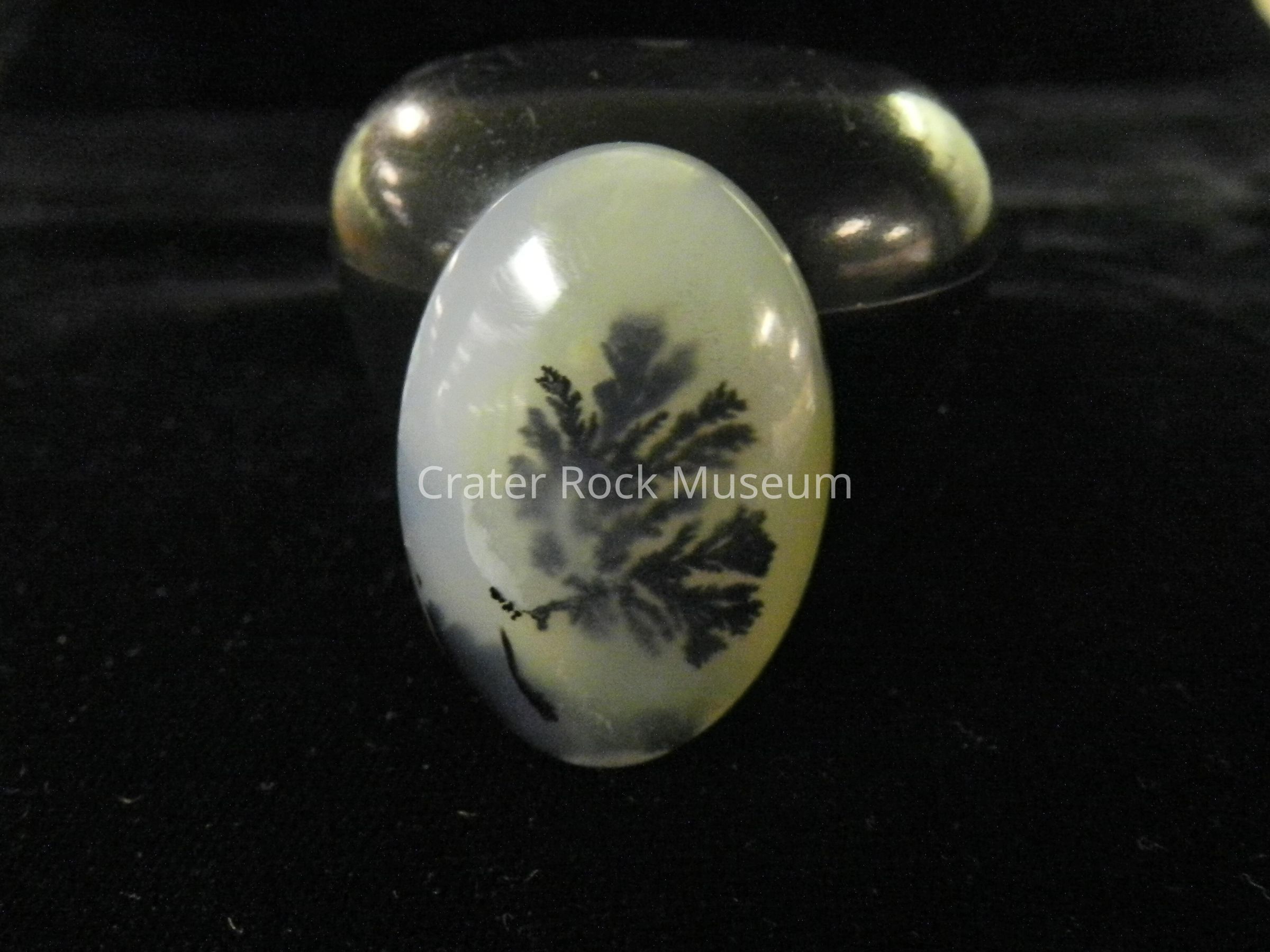 Description: Oval shaped with flat back and convex polished face. Translucent creamy blue-gray and yellow with one dendritic structure in the center and one black area to one side.