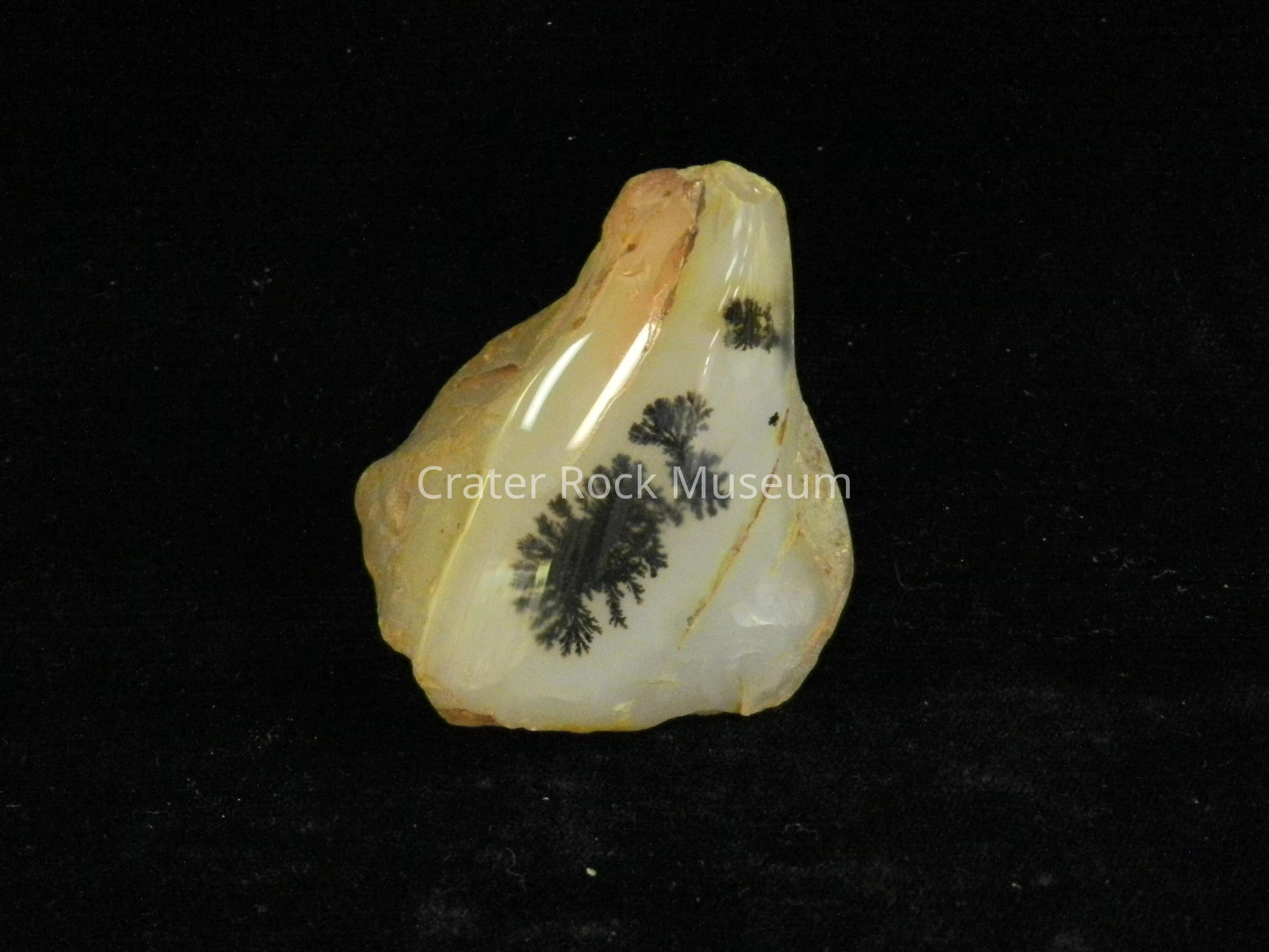 Description: Irregular shaped back with convex polished face. Transparent creamy white with redish-brown fracturing and three dendritic structures; one large and one small.