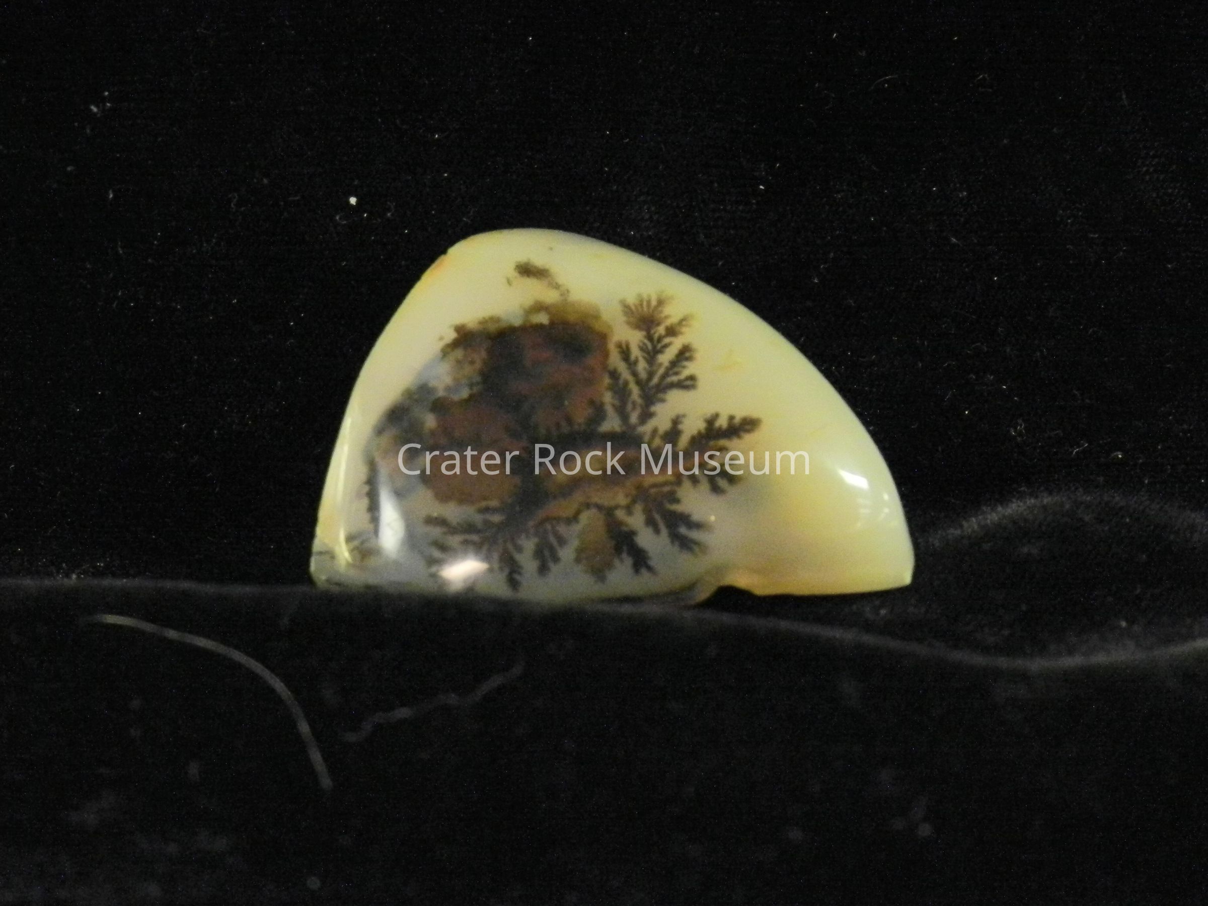 Description: Triangular shape with smooth, flat back and convex polished face. Translucent creamy yellow and blue-gray with one large dendritic structure with some branching and some solid.