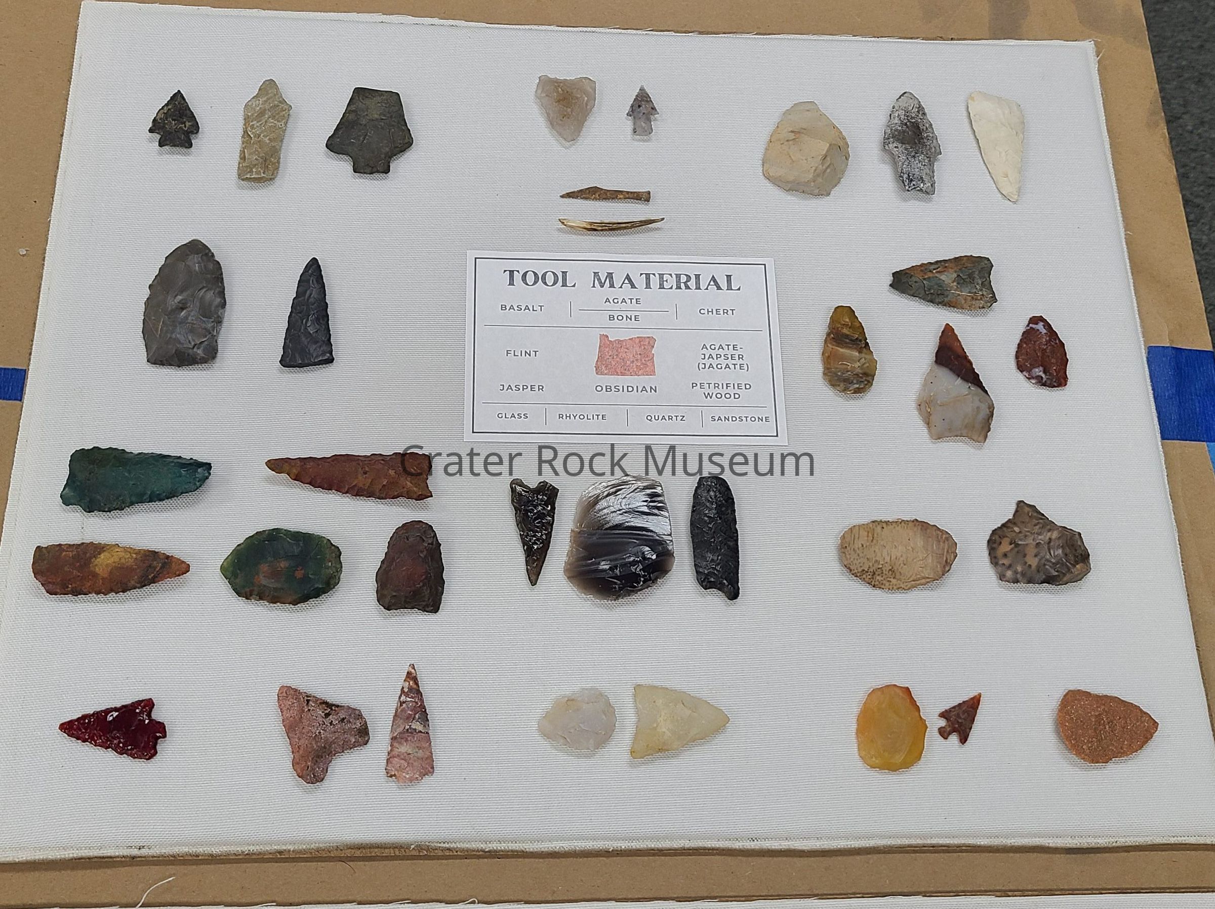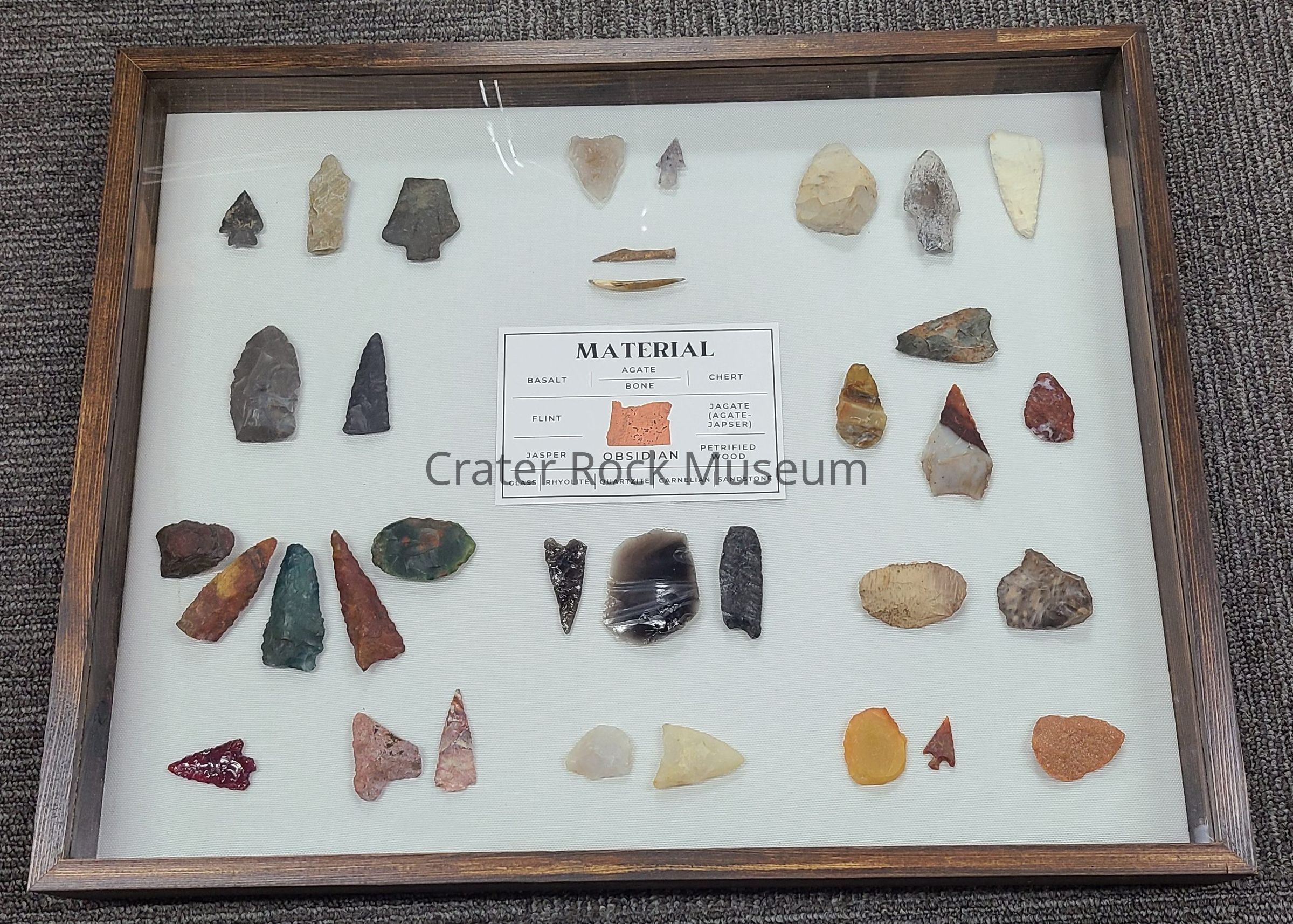 A collection of 34 examples of workable lithic and organic materials in a shadow box, assembled as part of the 2024 Oregon Heritage Grant