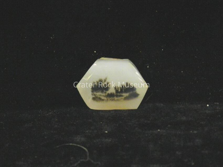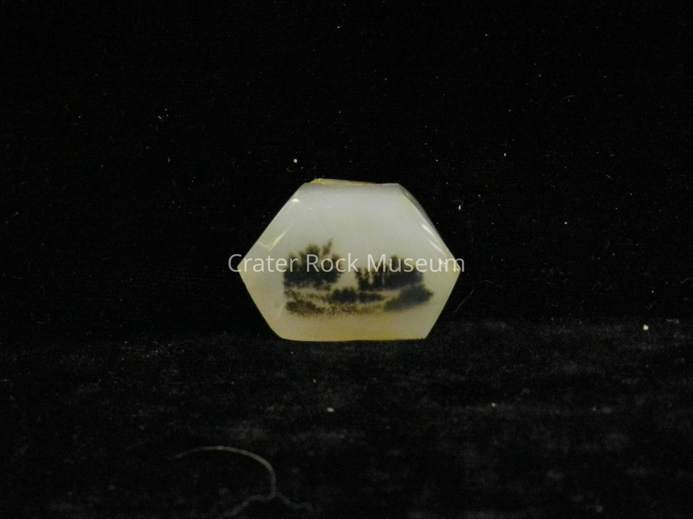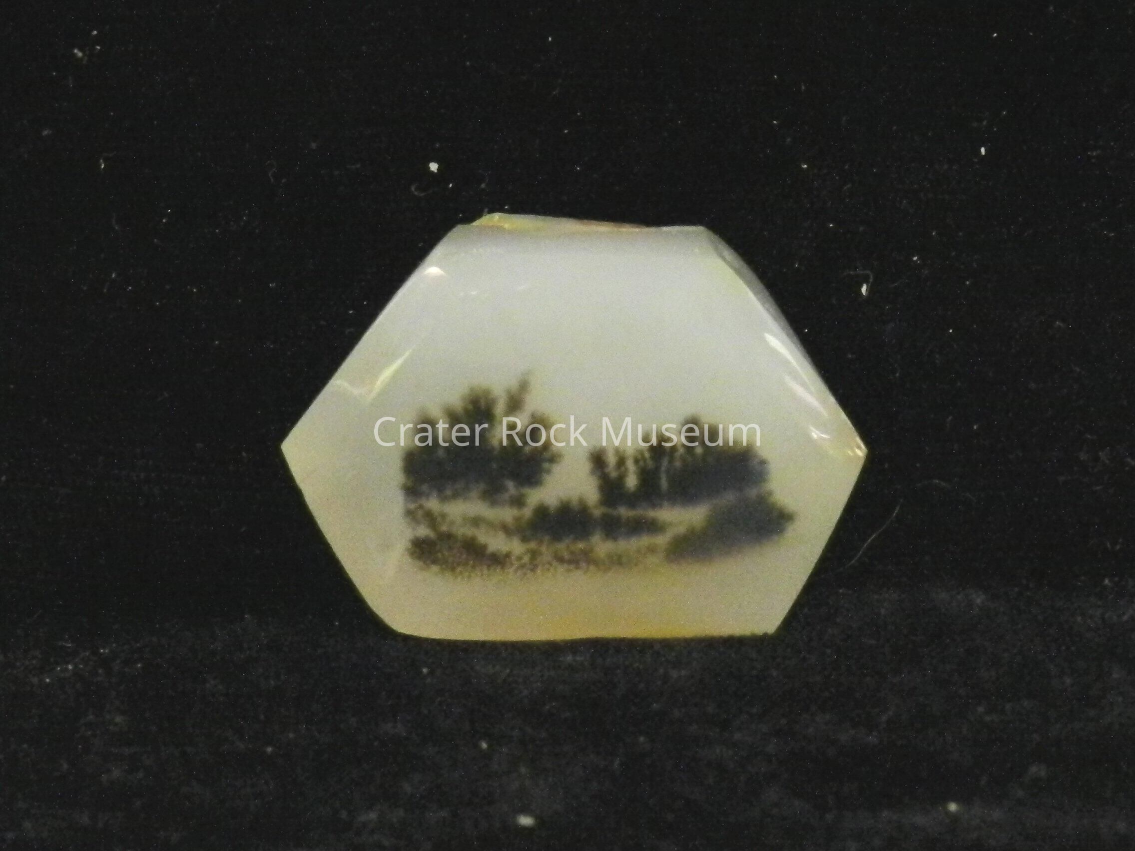 Description: Six sided with flat back and polished face. Sides are somewhat polished. Translucent creamy white and yellow with dendritic structures in center resembling a landscape.