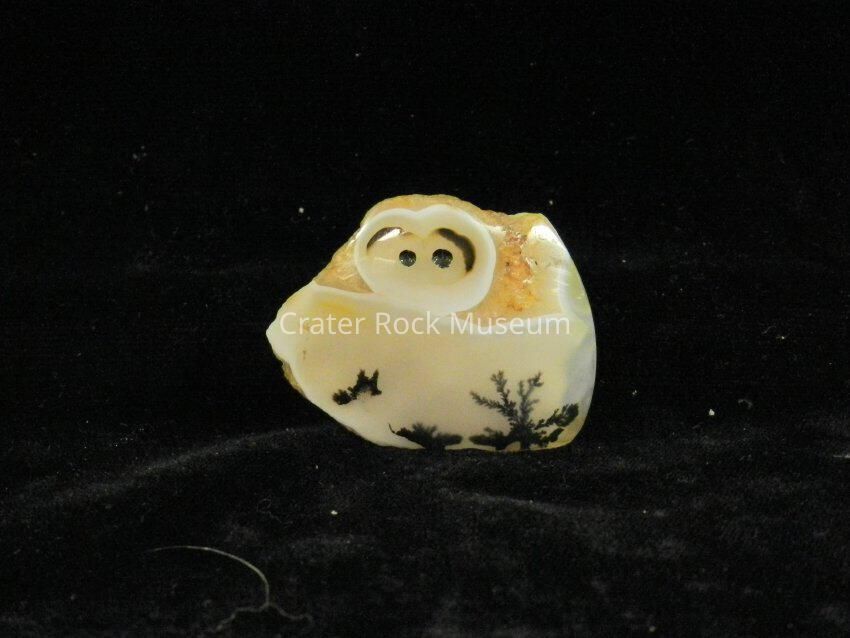 Description: Irregular shape with two polished sides. Translucent creamy white and yellow with reddish-brown matrix with "face" with two "eyes" and dendritic structure below that.