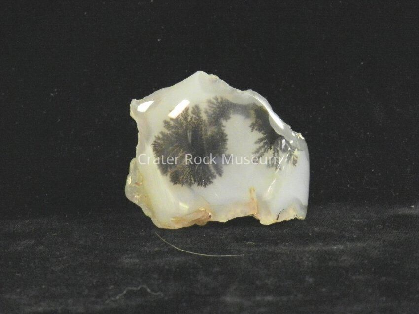 Description: Irregular, rough with polished face. Translucent creamy white with two dendritic structures (merged at bottom).