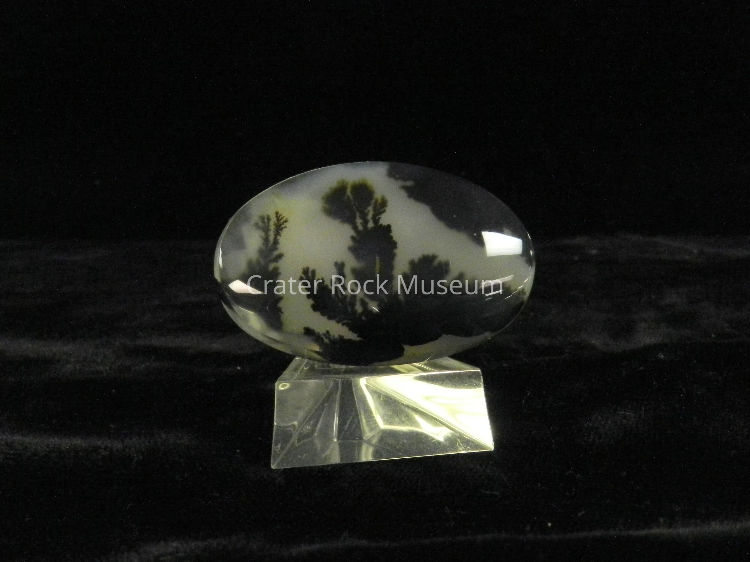 Description: Oval with convex polished face. Transparent creamy white with multiple black dendritic structures.