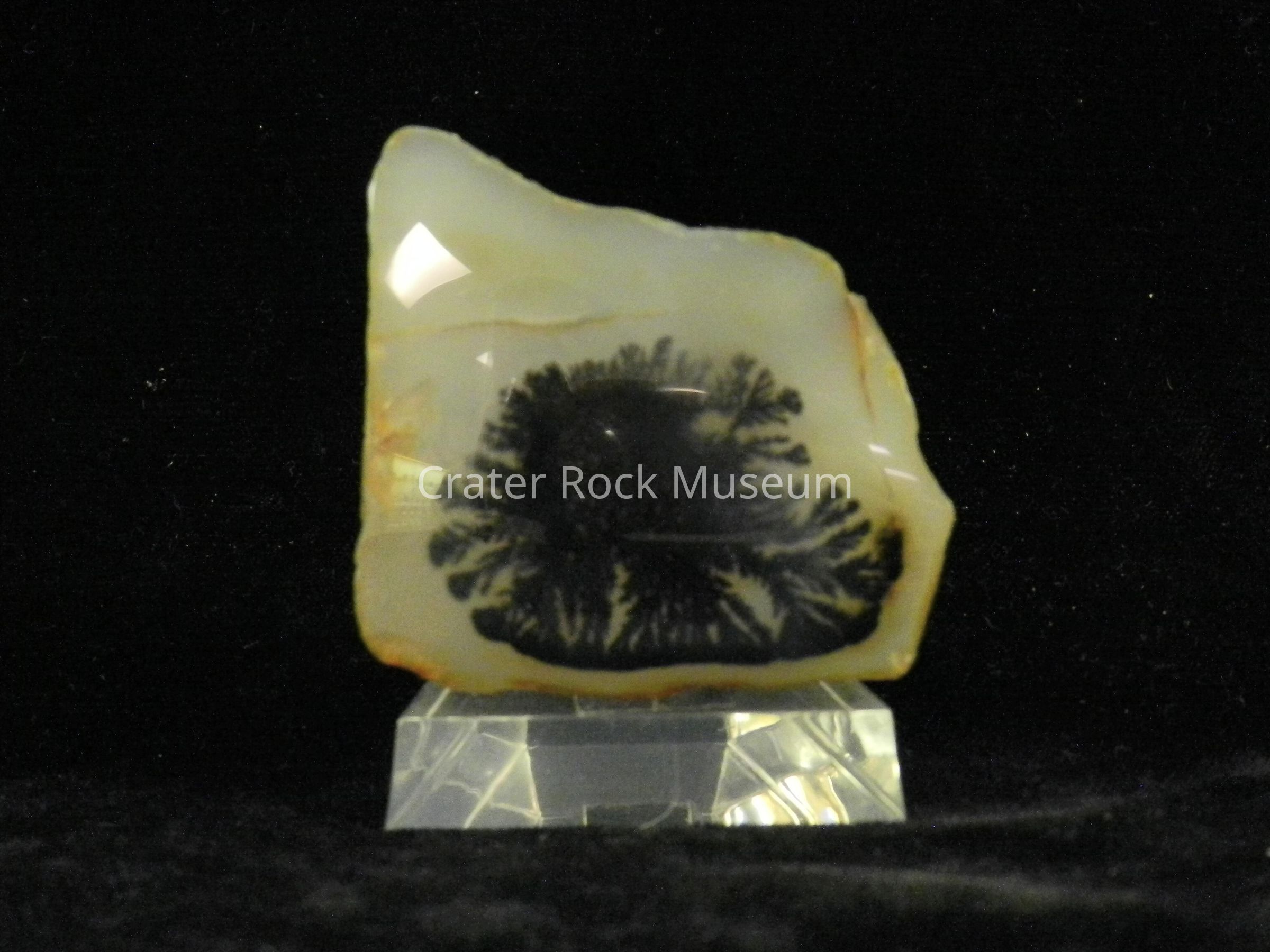 Description:Thin slice with polished, slightly convex face. One large dendritic structure with some redddish-brown fracturing.