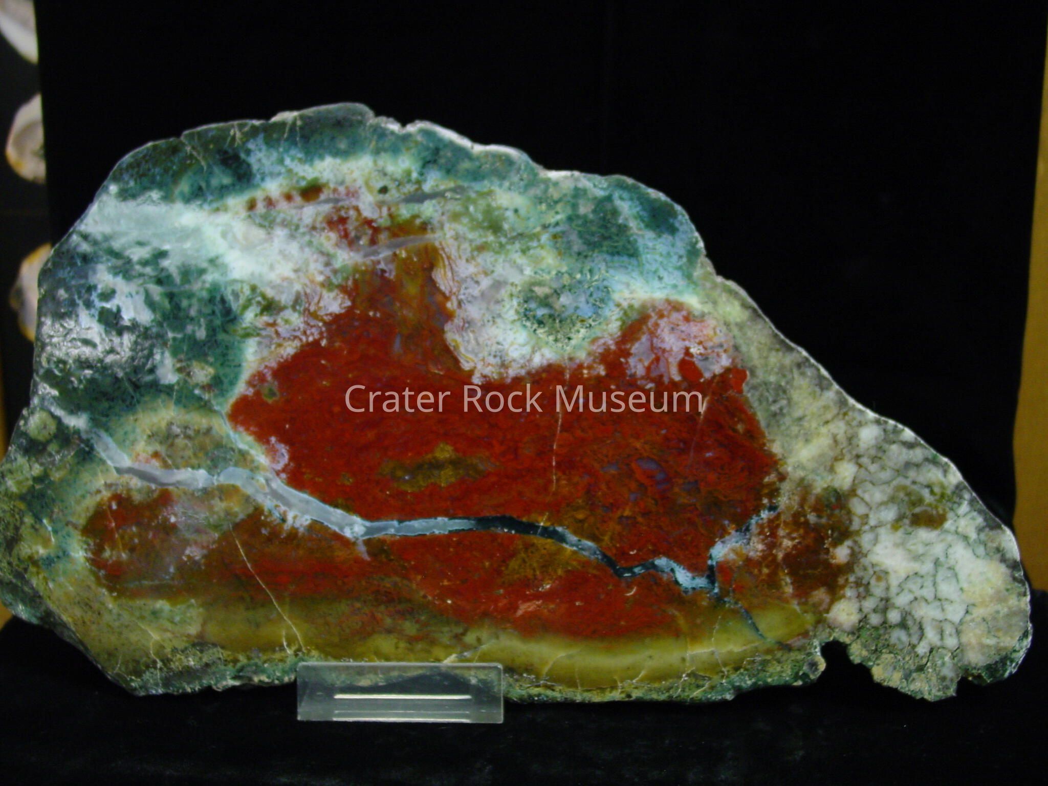 Description: One agate nodule, cut and polished. Heavily deposited with minerals. Red and green in color, indicating iron.Collection