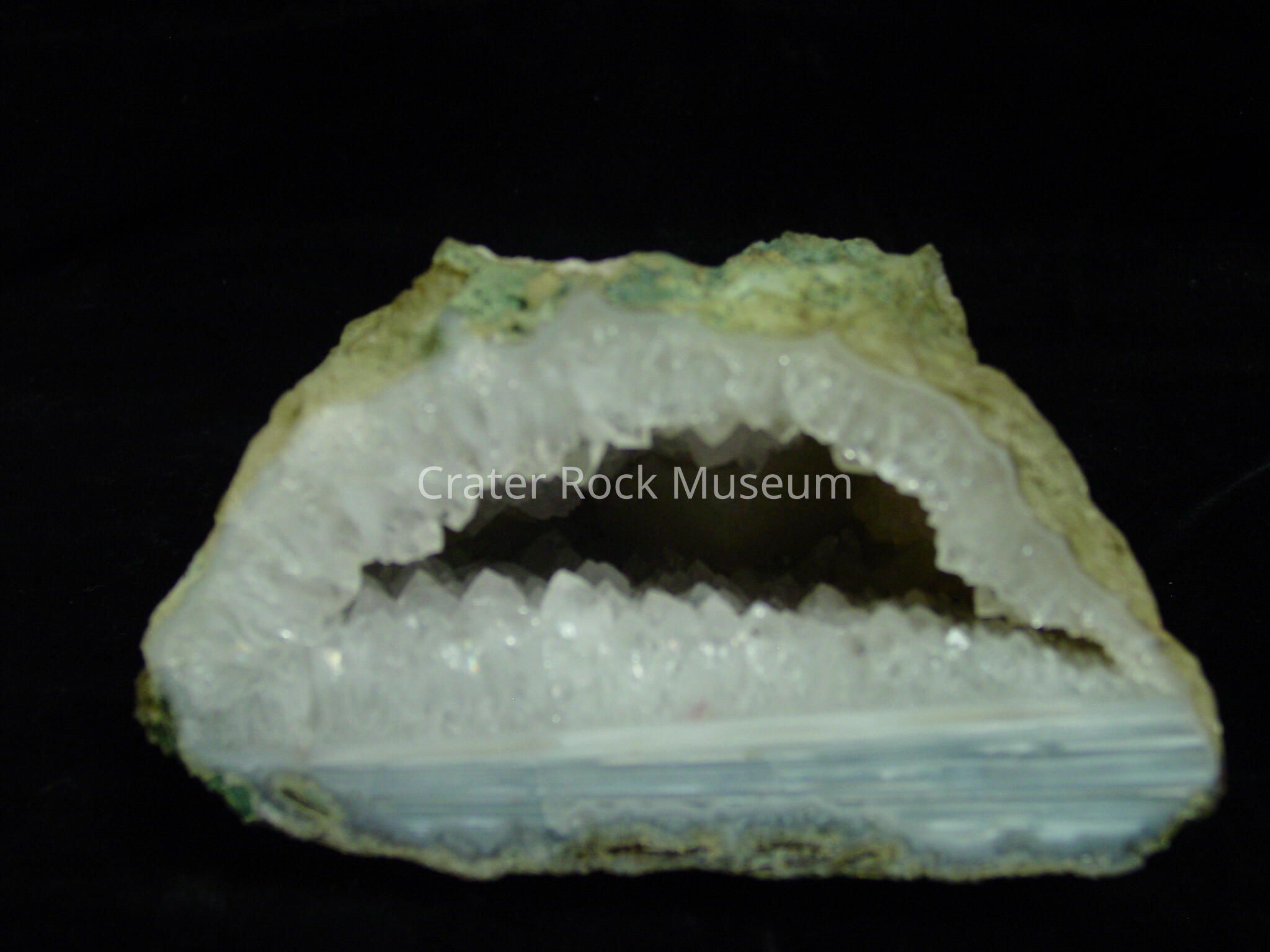 Descripton: One crystal specimen, cut and polished. A white quartz crystal geode from Crooked River Area, Eastern Oregon. White and grey bedding lines on one side, crystal on the other.Collection