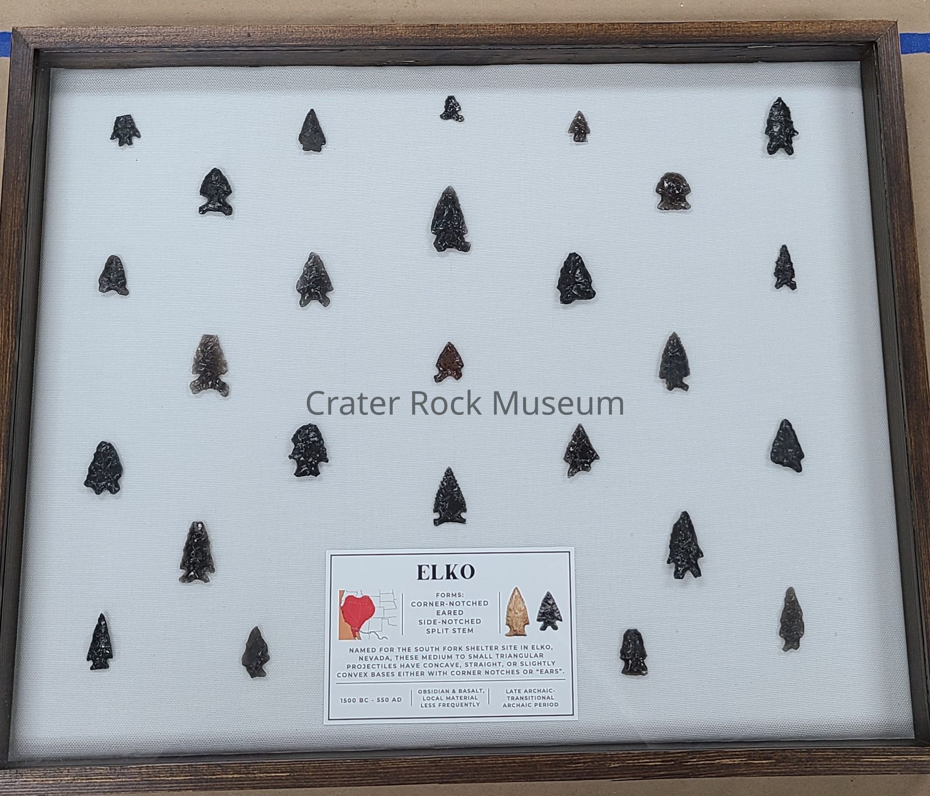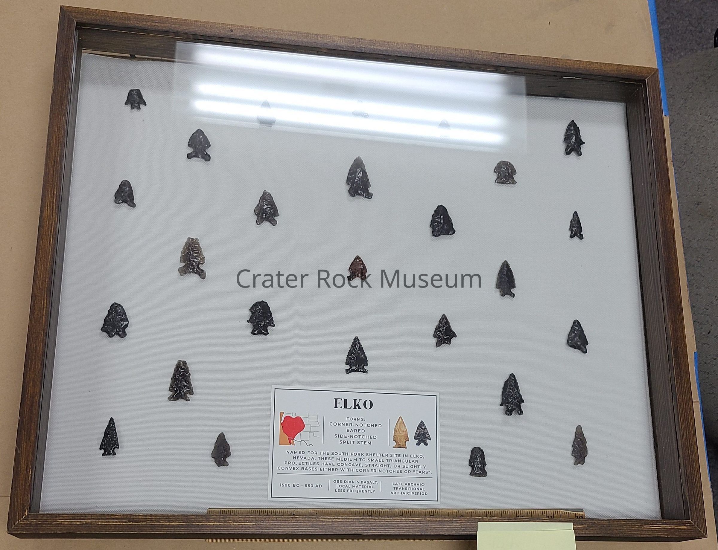 A collection of 26 projectile points in a shadow box representing the various forms of the Elko series, assembled as part of the 2024 Oregon Heritage Grant