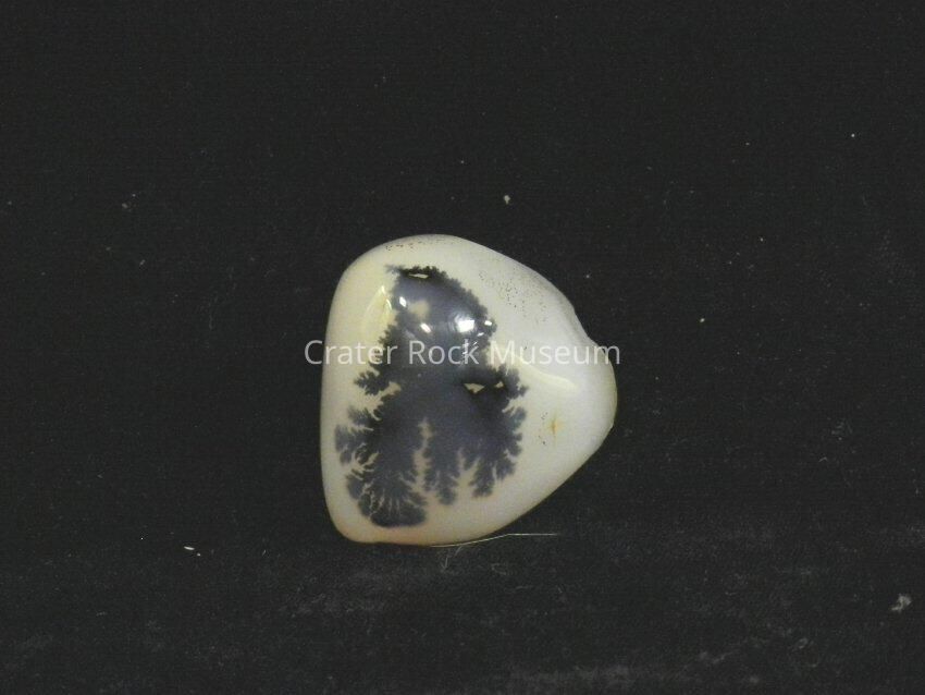 Description: Rough back with rounded, polished face. (semi-triangular) Translucent creamy white and some reddish-brown highlights. One large dendritic structure.