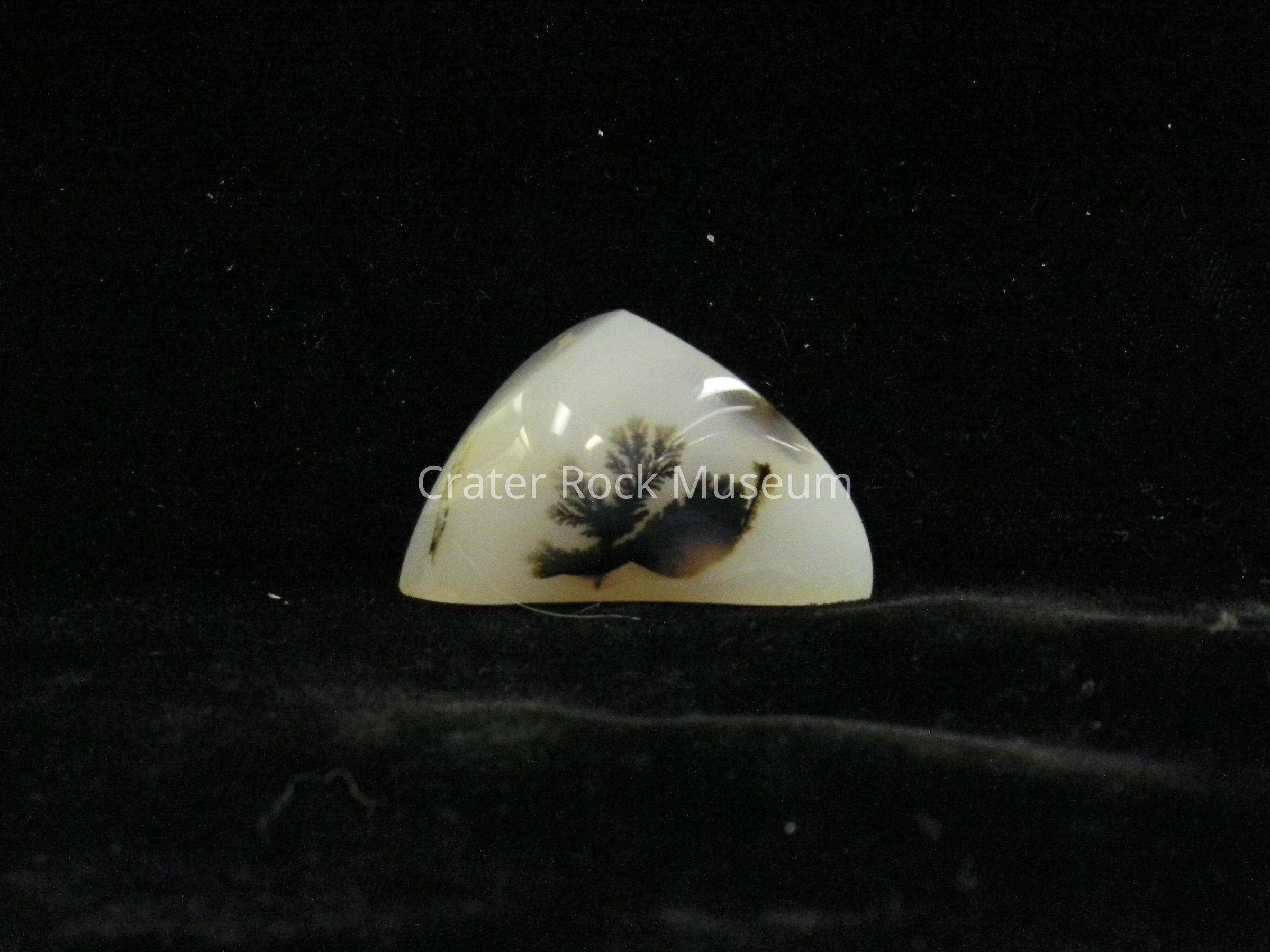 Description: Irregular shaped , with semi-triangular convex polished face. Translucent creamy white with light and dark brown dendritic structure in center.