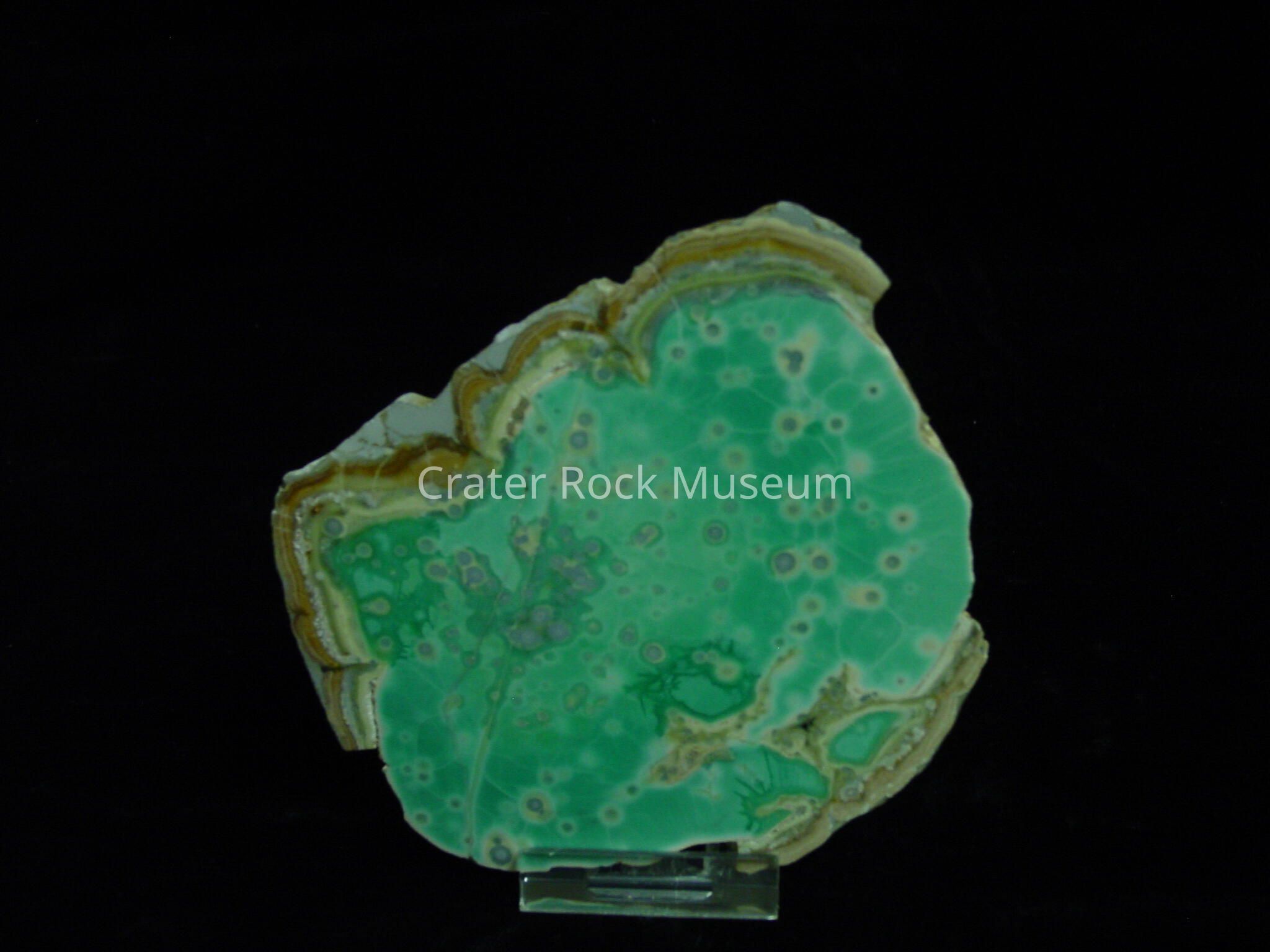 Variety: Variscite is a relatively rare phosphate mineral that is sometimes confused with turquoise. It is usually greener, however, than turquoise. Variscite is sometimes used as a semi-precious stone and can make distinctive color patterns that are very attractive. Occassionally it is altered into other phosphate minerals. This can occur in what were perhaps weak layers of a nodule since only portions of the variscite nodules are altered. The most common alteration mineral is crandallite, CaAl3(PO4)2(OH)5-H2O, and gives some nodules a yellow or white layer.Collection