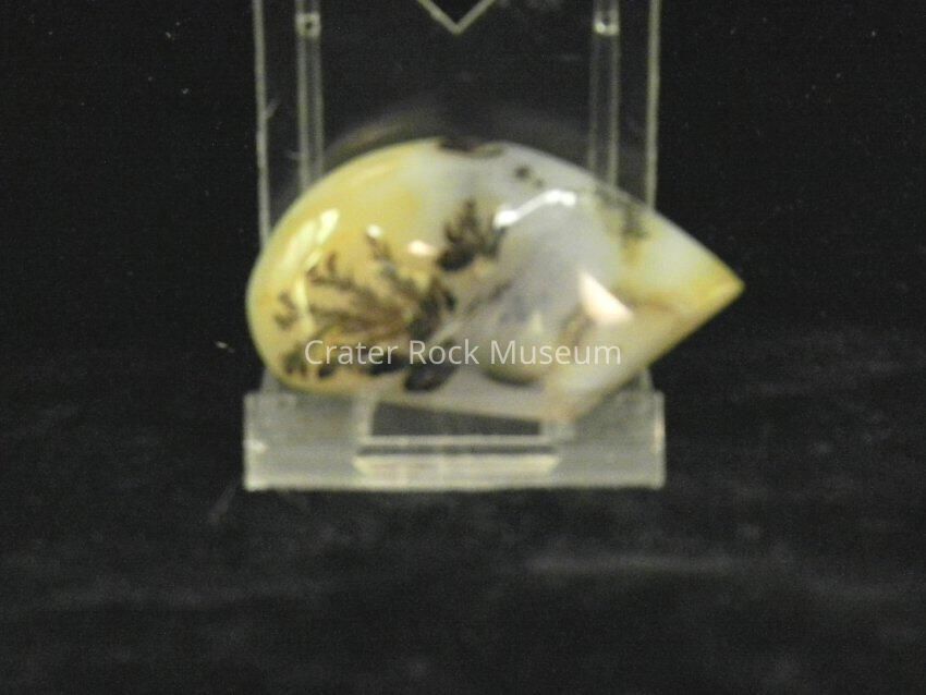 Description:Flat back with irregular rounded polished face. Translucent creamy yellow and white with one dendritic structure and a couple of spots with fracturing.