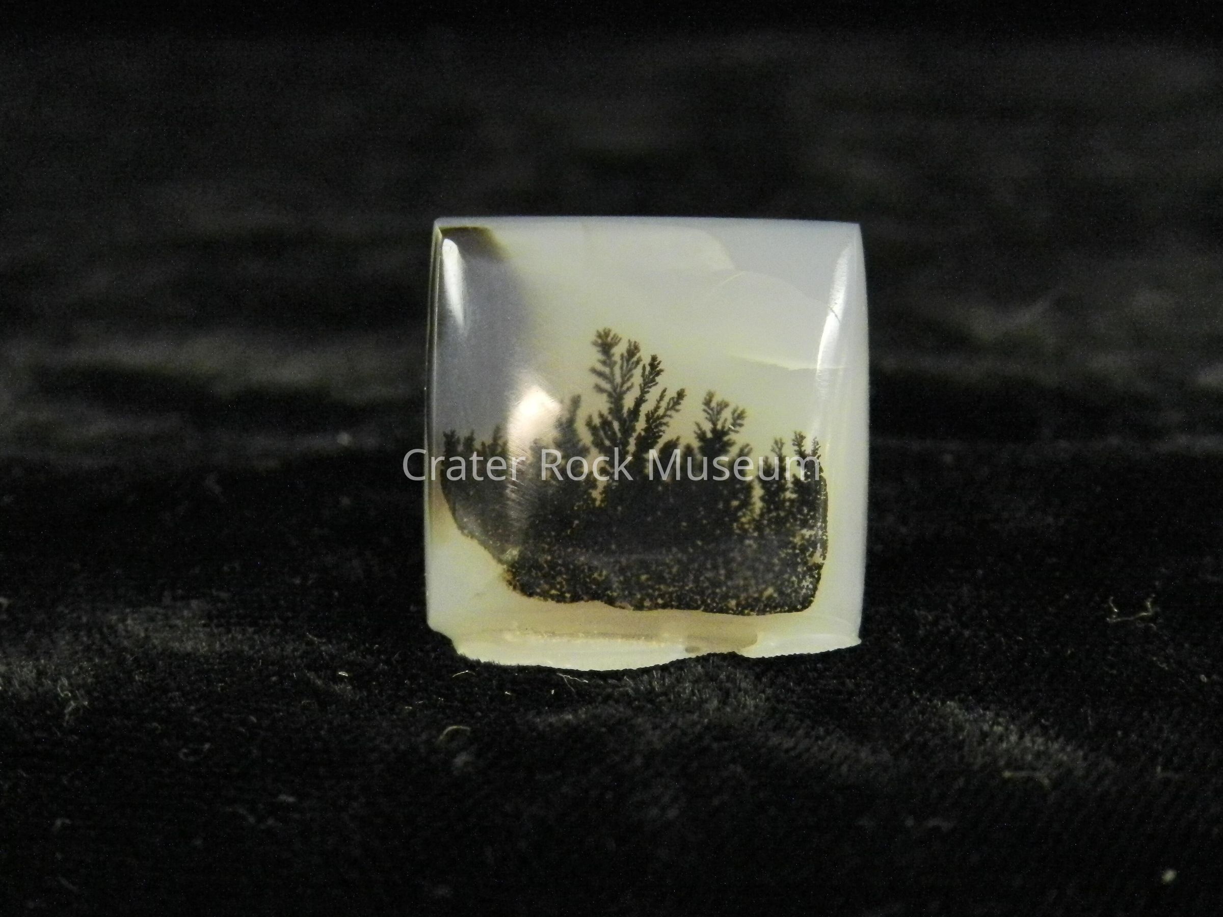 Description:(cuff link) Square with polished, slightly convex face. Translucent creamy white with one dendritic structure and a cloudy spot in one corner.