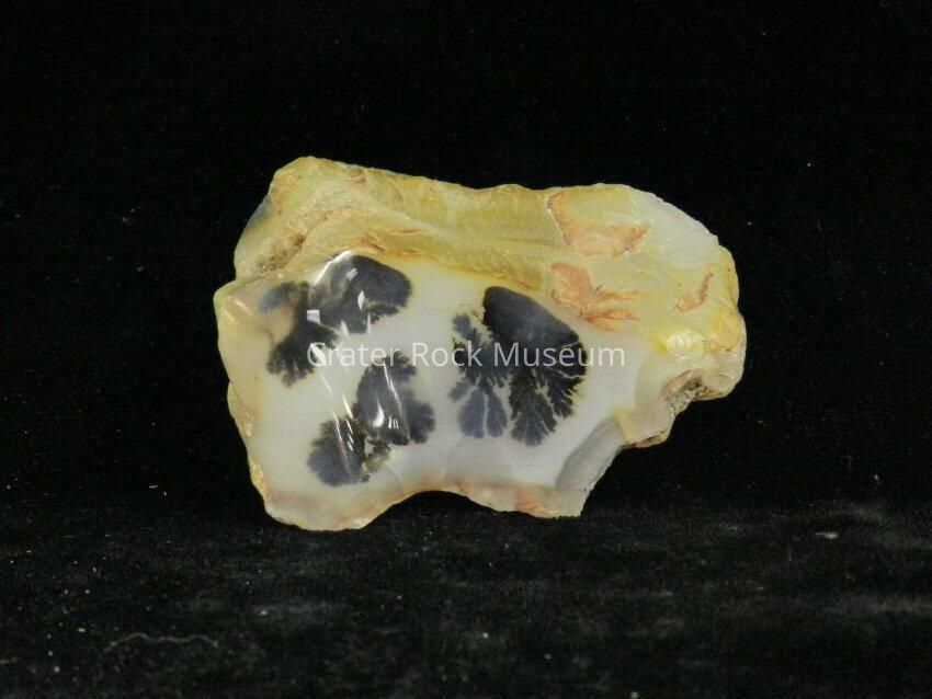 Description: Irregular shape with opposing polished faces. Translucent creamy white and yellow with three dendritic structures on one face and a single one on the other.