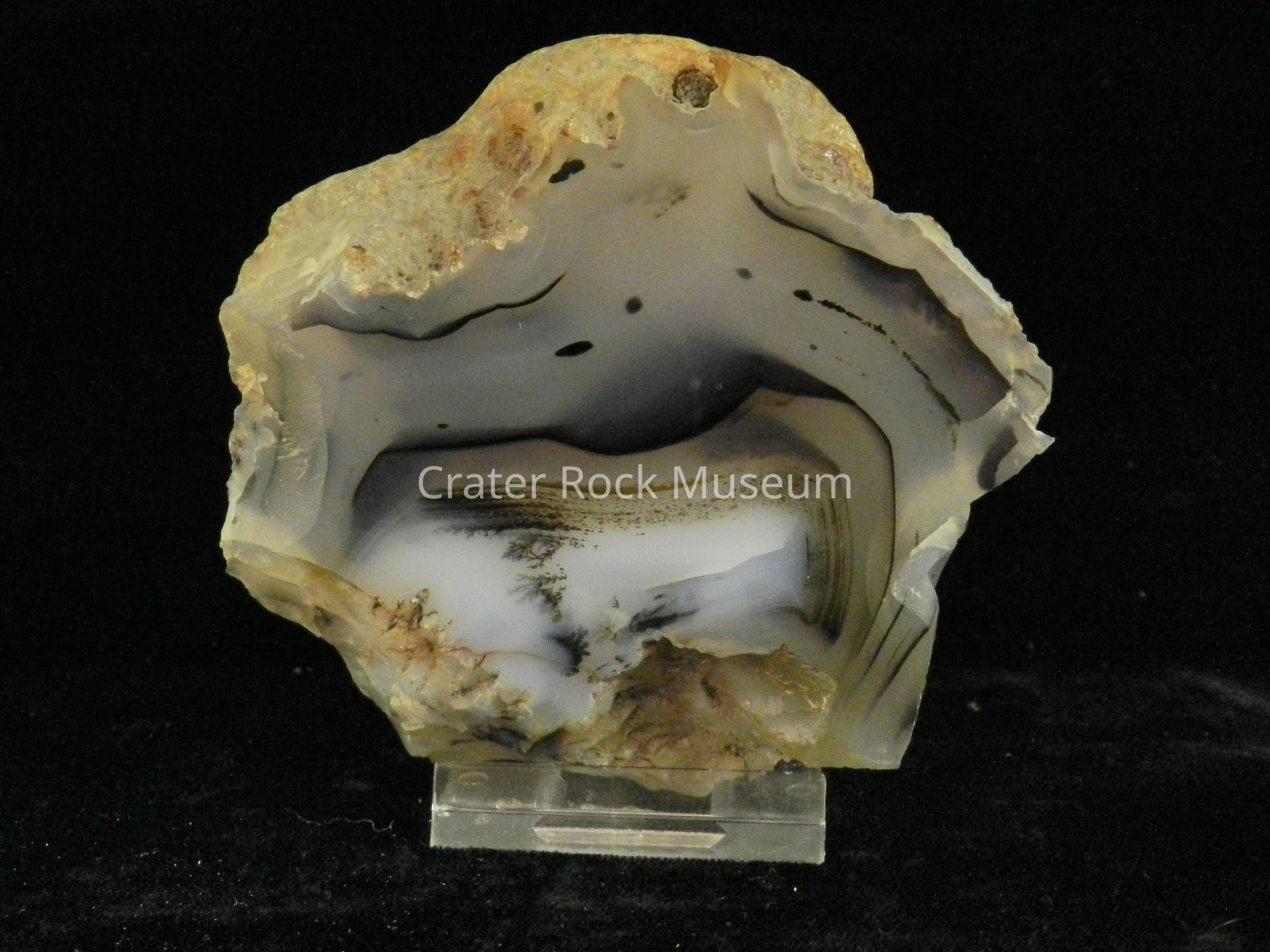 Description: Rough, rounded back with polished face. Transparent creamy tan, white and black with some reddish-brown banding along fractures in black and white.
