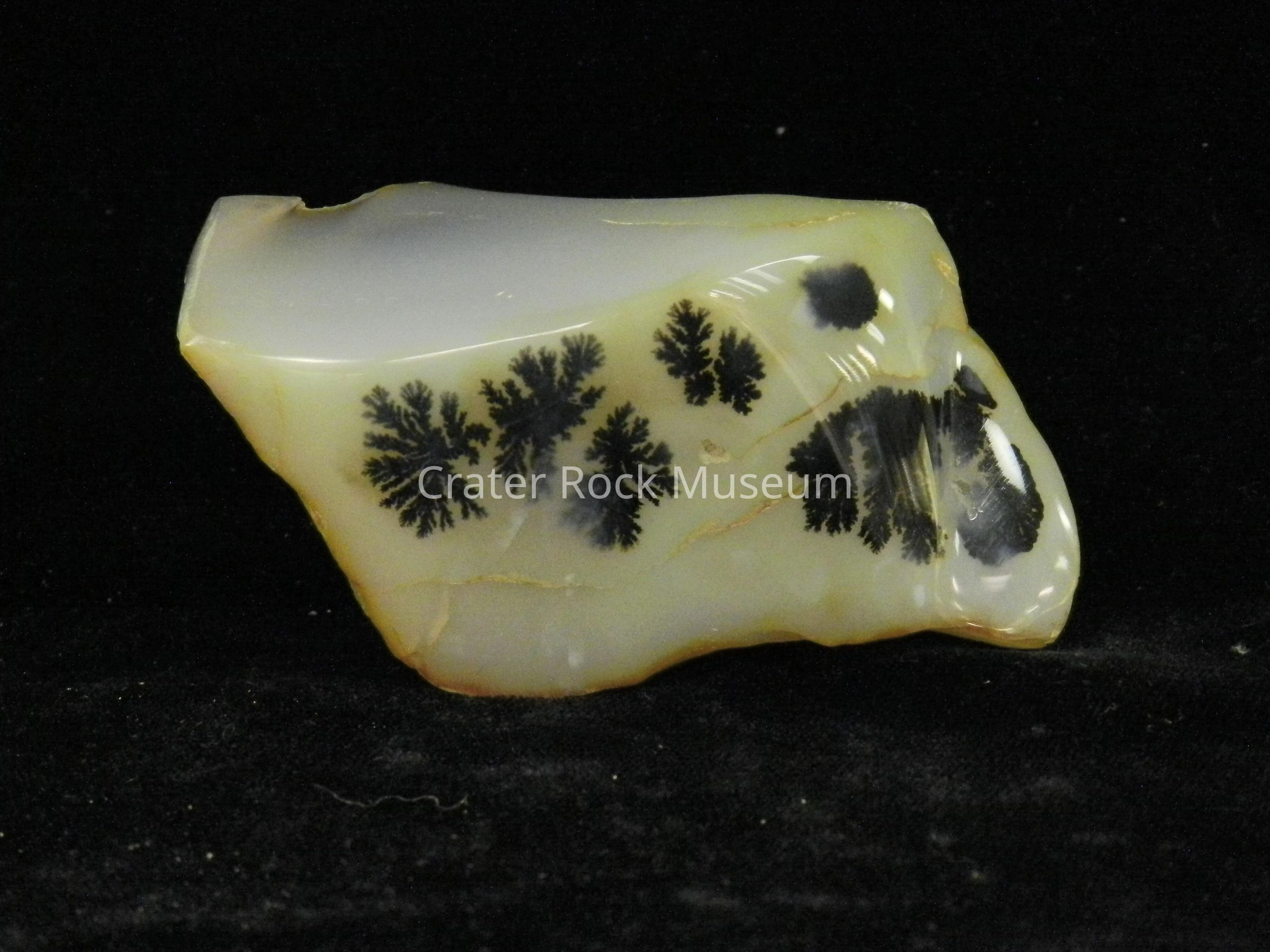 Description: Block shaped with fairly smooth sides and two polished sides. Translucent creamy yellow and white with reddish-brown highlights. Six small dendritic structures.
