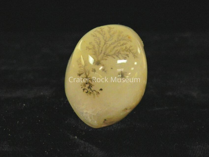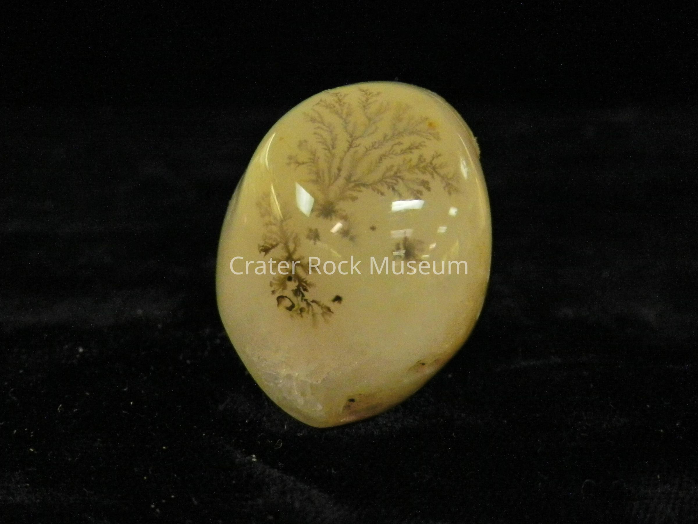Description: Acorn shaped with larger side polished. Translucent creamy yellow with faint light brown dendritic structure.