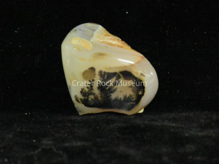 Description: Irregular, rounded back with two polished sides. Translucent blue-gray with some reddish-brown streaks. One dendritic structure on each face.