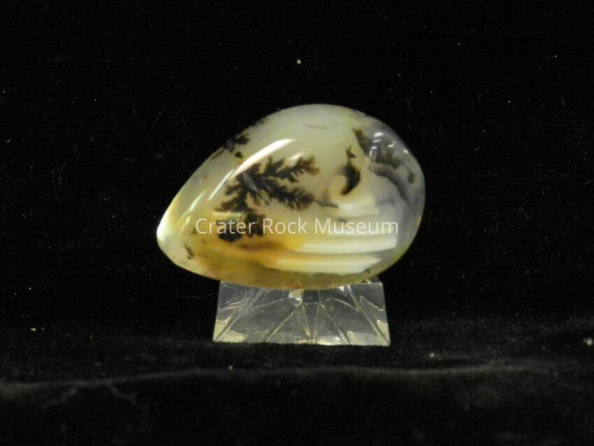 Description: (Mounted) Semi tear drop, flat back, convex polished face. Creamy yellow and white with three white bands; one brown dendritic structure with spots on outer edge.