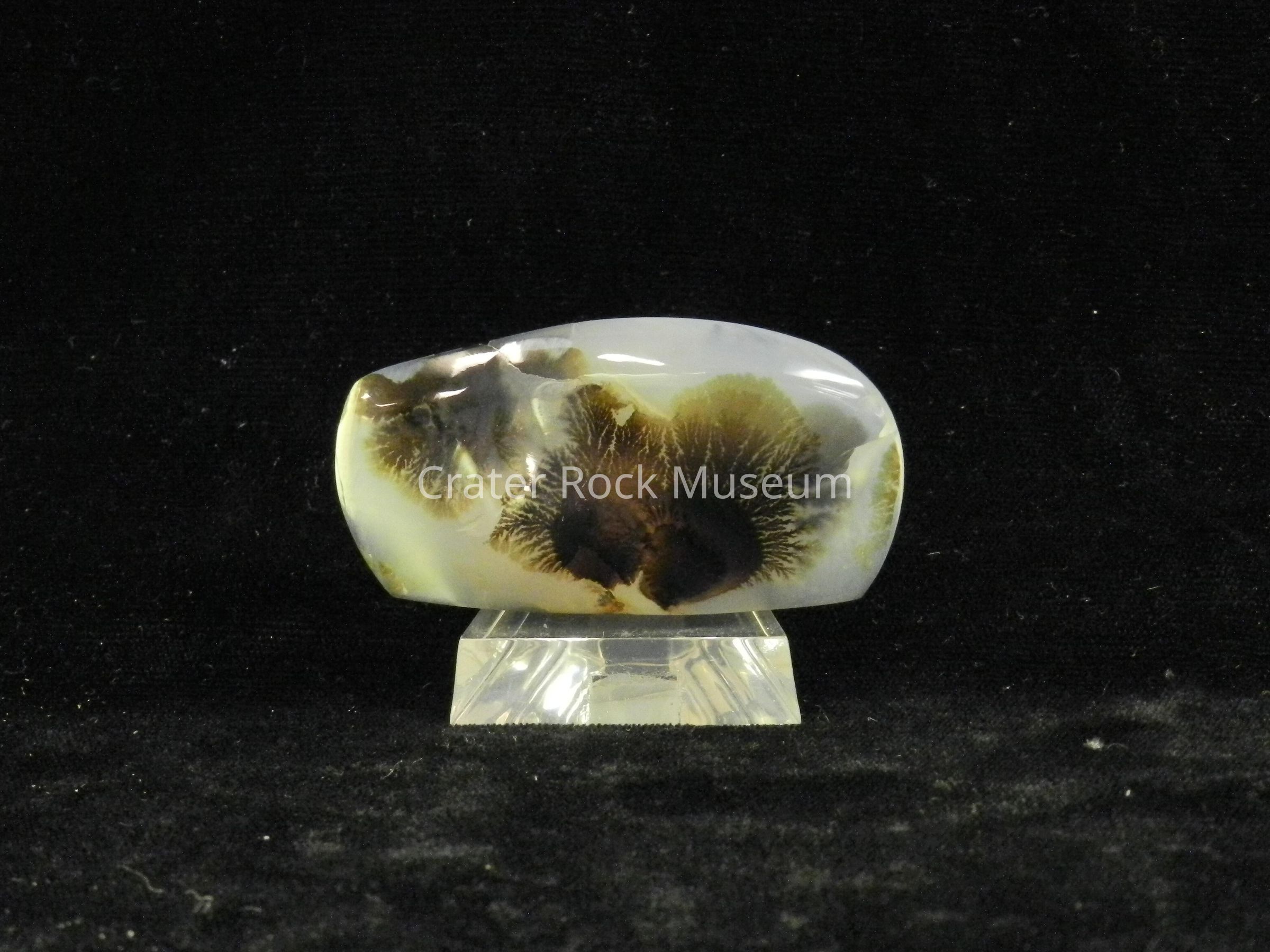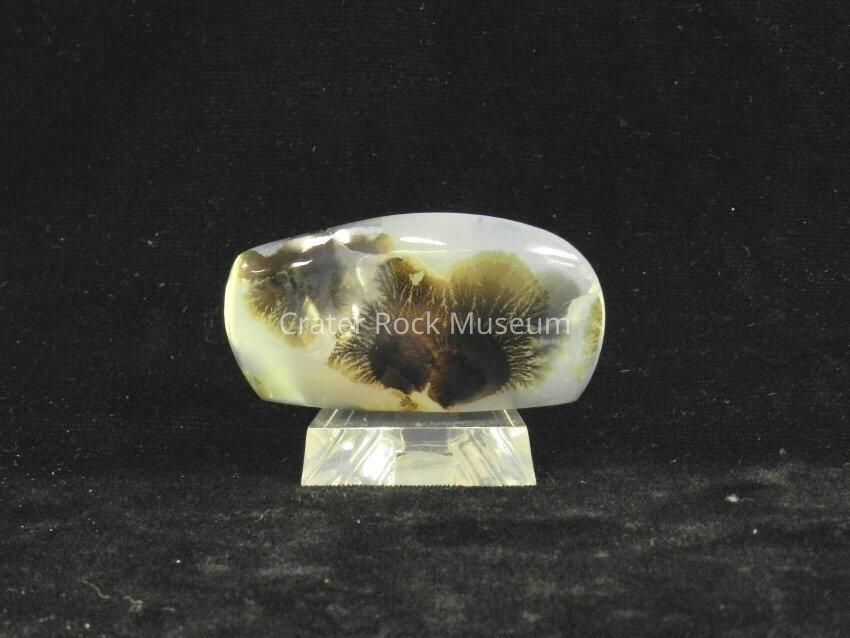 Description: (Mounted) Thin slice with flat back and a dimpled polished face. Creamy translucent yellow with two merged light brown dendritic structures and a single dendritic structure in upper corner.