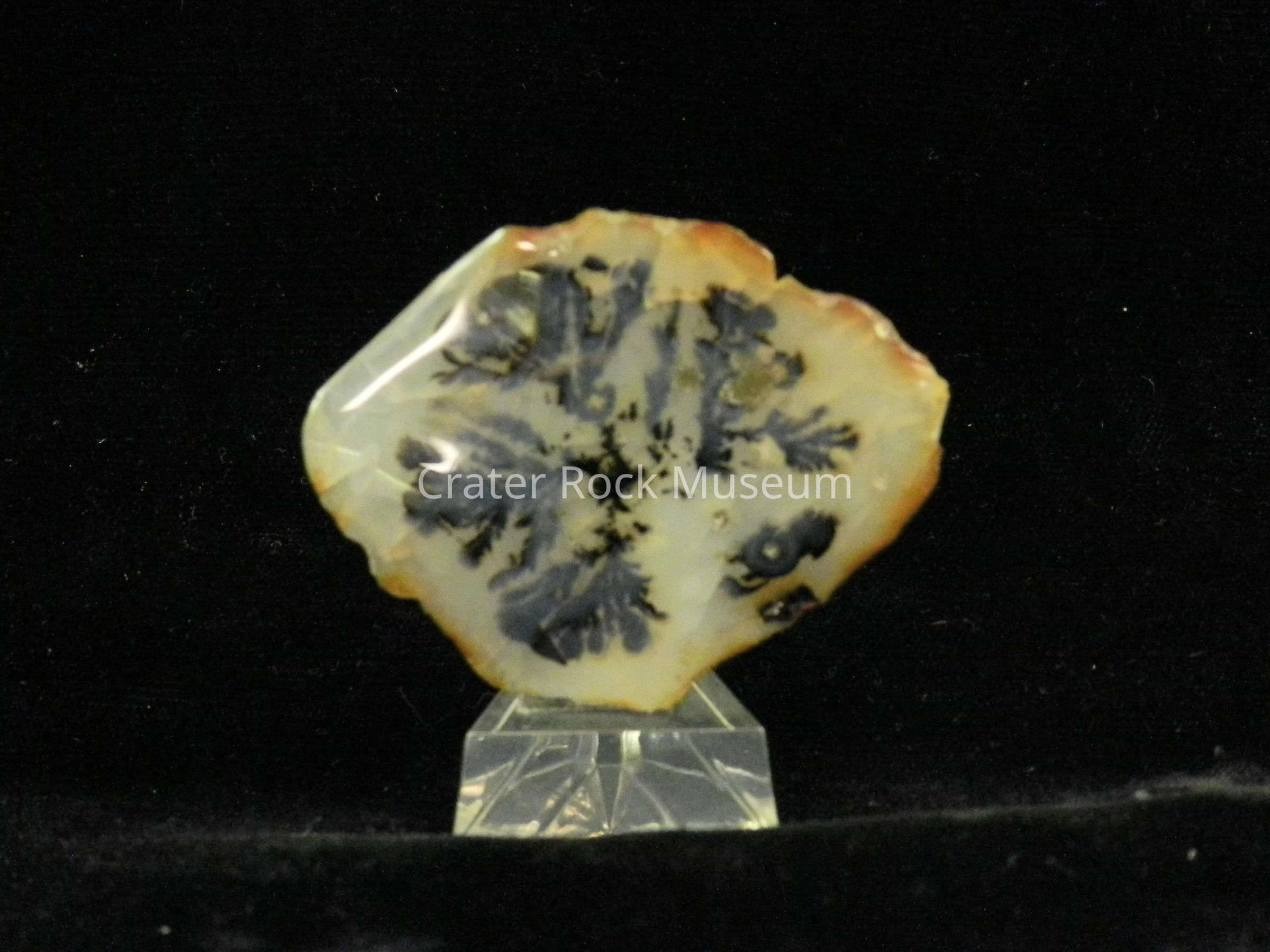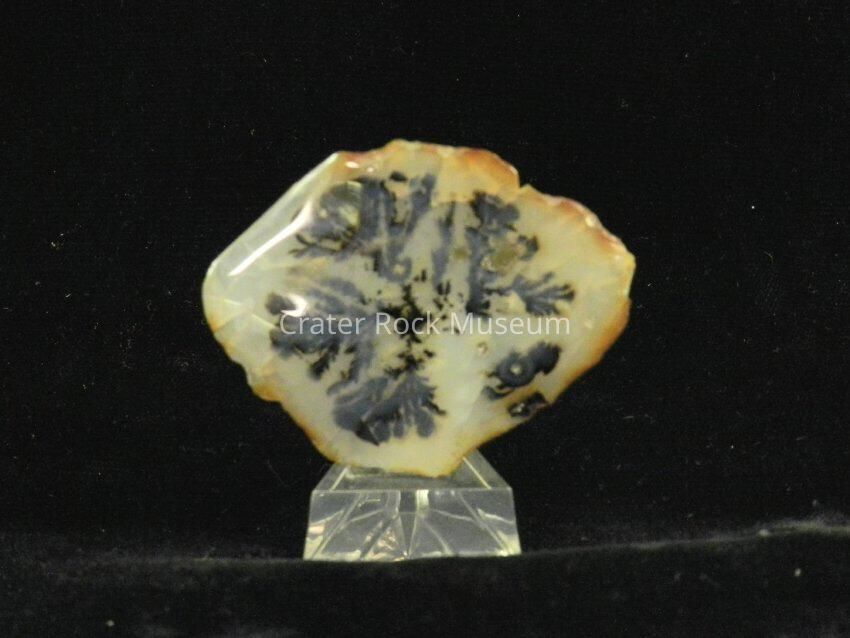 Description: (Mounted) Thin slice with flat back and a polished face. Translucent creamy white with reddish-brown highlights on outer edges. Multiple splayed dendritic structures in center.