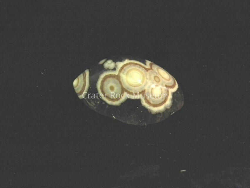 Description: Rough flat back with rounded polished face. Dark brown with multiple merged beige and brown banded orbicular structures.